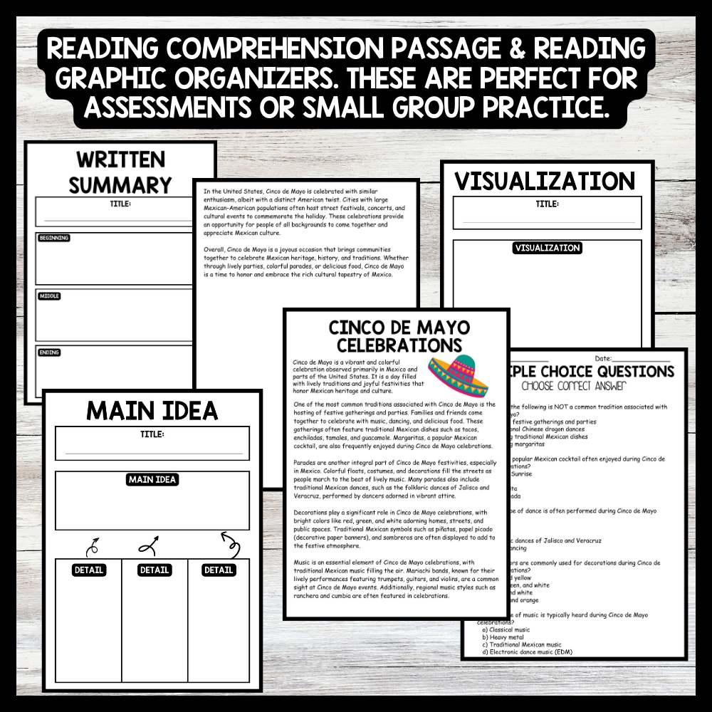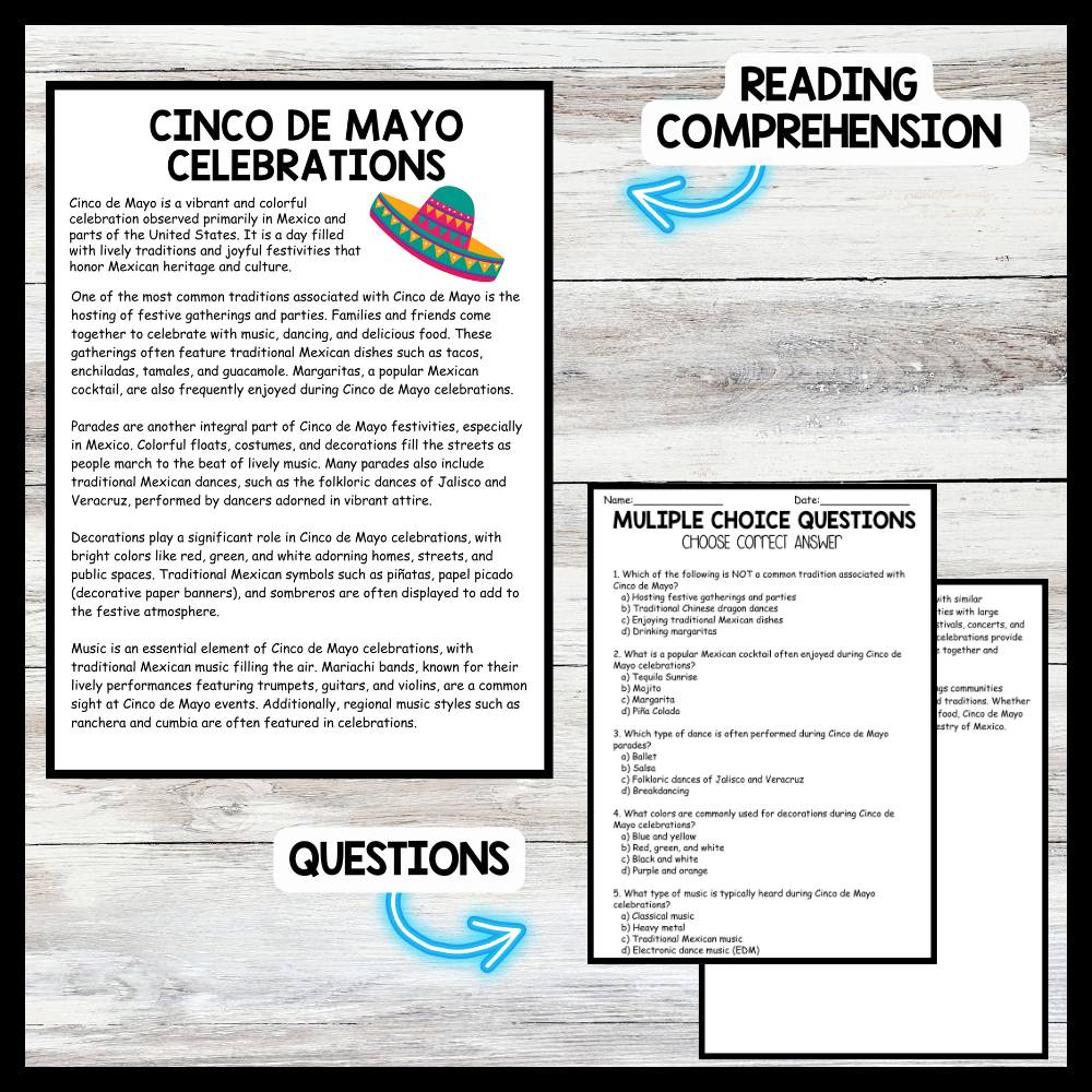 Grow your students knowledge with this Nonfiction Reading Comprehension Passage -  Cinco de Mayo Celebrations These reading practice passages are perfect for: warm-up, bell work, homework, or weekly assessments. Students can use independently in literacy groups, guided reading groups. Different...View more
