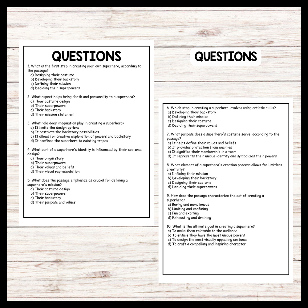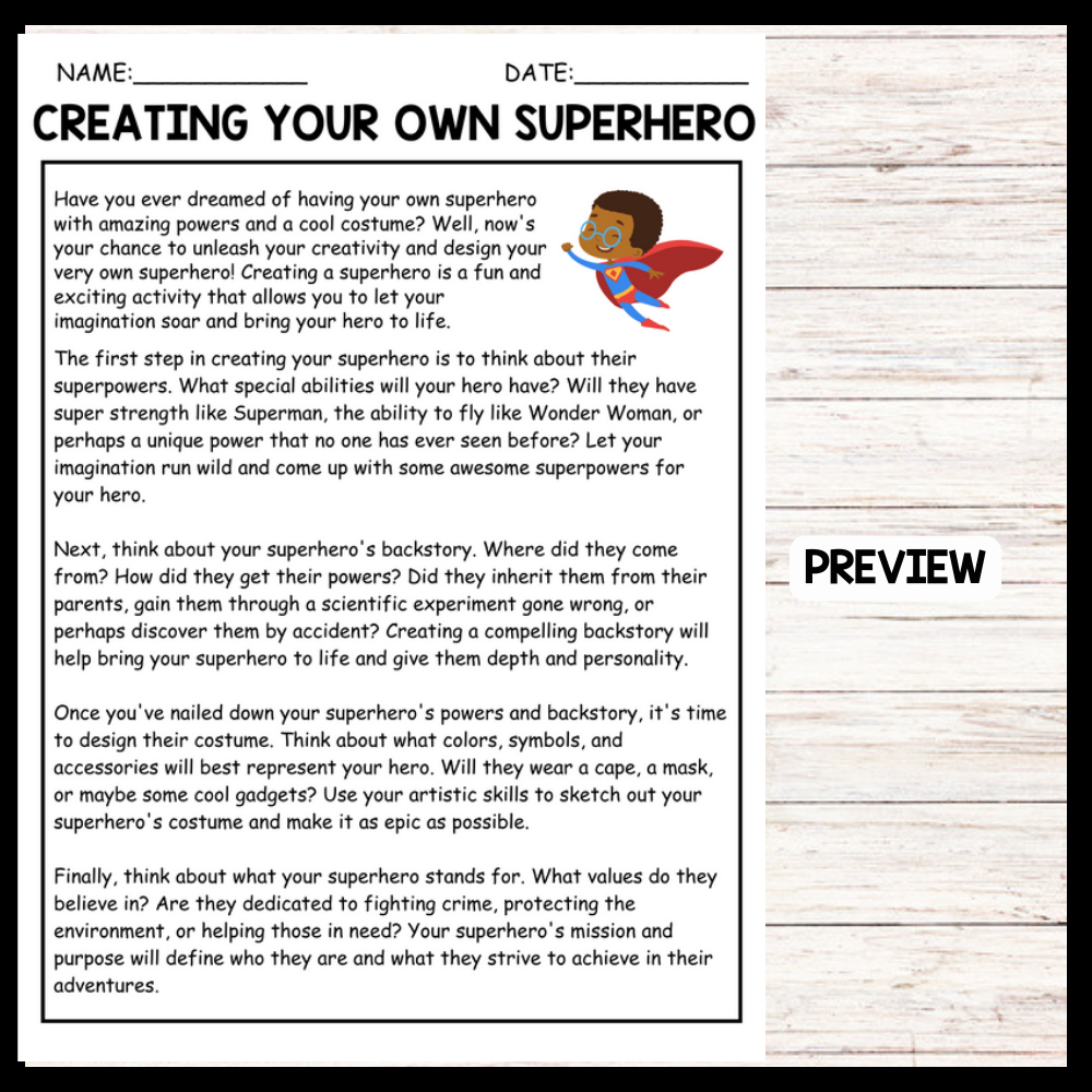 This passage guides students through creating their own superhero by brainstorming superpowers, backstory, costume design, and values. It's helpful for teachers as it engages students' creativity and critical thinking in a simple and easy-to-understand way.