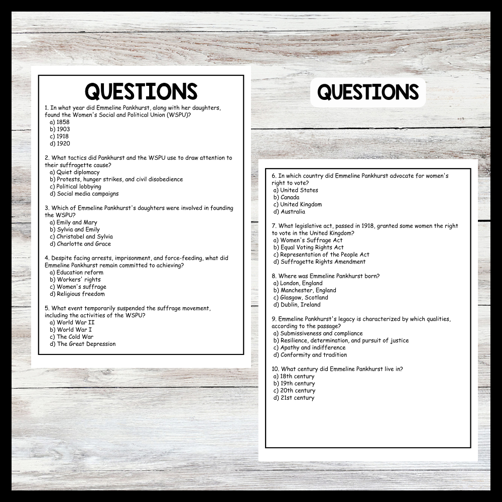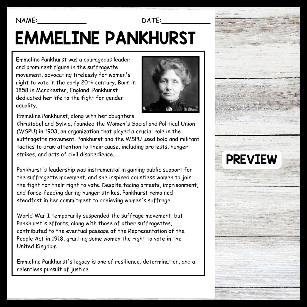 This passage provides a concise overview of Emmeline Pankhurst's pivotal role in the women's suffrage movement, highlighting her leadership and the bold tactics used by the Women's Social and Political Union (WSPU). It's helpful for teachers as it offers a clear and straightforward explanation of Pankhurst's contributions, making it easy for students to understand and engage with her historical significance.