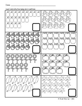 This is an activity sheet to help students correctly count, identify and write the correct numeral to match a set of objects up to 20. It has fall themed pictures for the students to count.