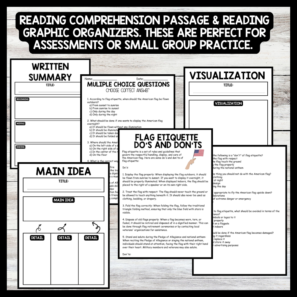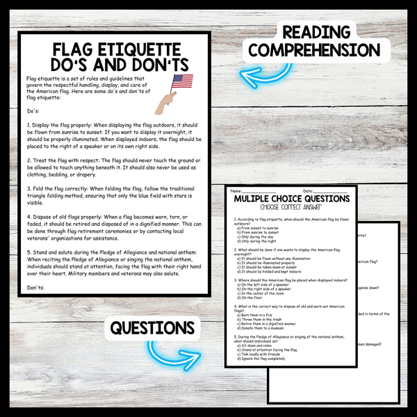 Grow your students knowledge with this Nonfiction Reading Comprehension Passage - Flag Day - Flag Etiquette These reading practice passages are perfect for: warm-up, bell work, homework, or weekly assessments. Students can use independently in literacy groups, guided reading groups....View more