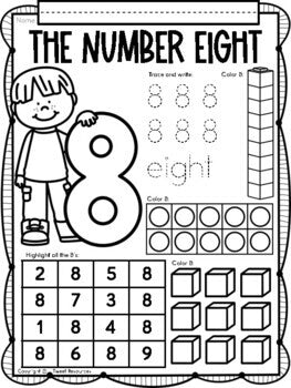 9. Let’s Flip The ‘Number 8’ (1): In this interactive activity, students will cut the worksheet vertically and glue one half onto the other half to create a flip flap. Once assembled, students can color the pictures under the flap.