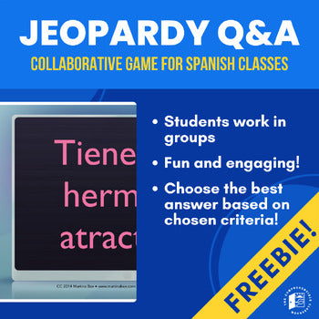 This game is perfect for Preferred Activity Time. On each slide, there is an answer in Spanish to a question. Students should work in groups to write the best/most creative/most logical question that would have solicited the answer shown. Consider having a panel of three or four students act as judges to vote on which question receives the point for each slide. Most slides are in past tense, so this version of the game would be appropriate for Spanish II (maybe late Spanish I).
