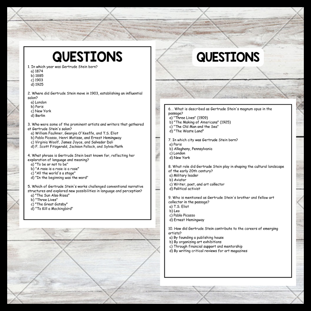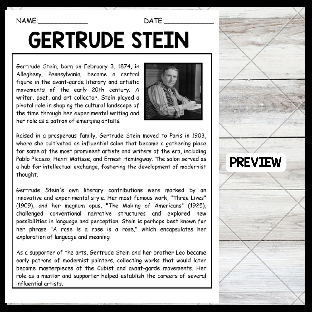 Raised in a prosperous family, Gertrude Stein moved to Paris in 1903, where she established an influential salon frequented by prominent artists and writers like Pablo Picasso, Henri Matisse, and Ernest Hemingway. This salon became a hub for intellectual exchange, fostering modernist thought. Stein's literary contributions, marked by an innovative and experimental style, include works like "Three Lives" and "The Making of Americans," which challenged conventional narrative structures. As a patron of the arts, she and her brother Leo collected significant modernist works, helping to establish the careers of several influential artists.