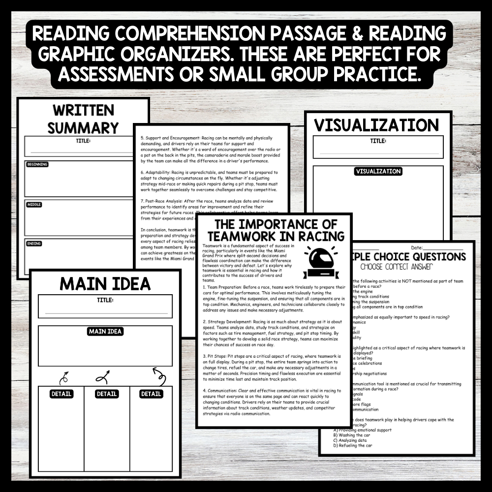 Different options provided- multiple choice, written response or graphic organizers to focus on individual skill.
