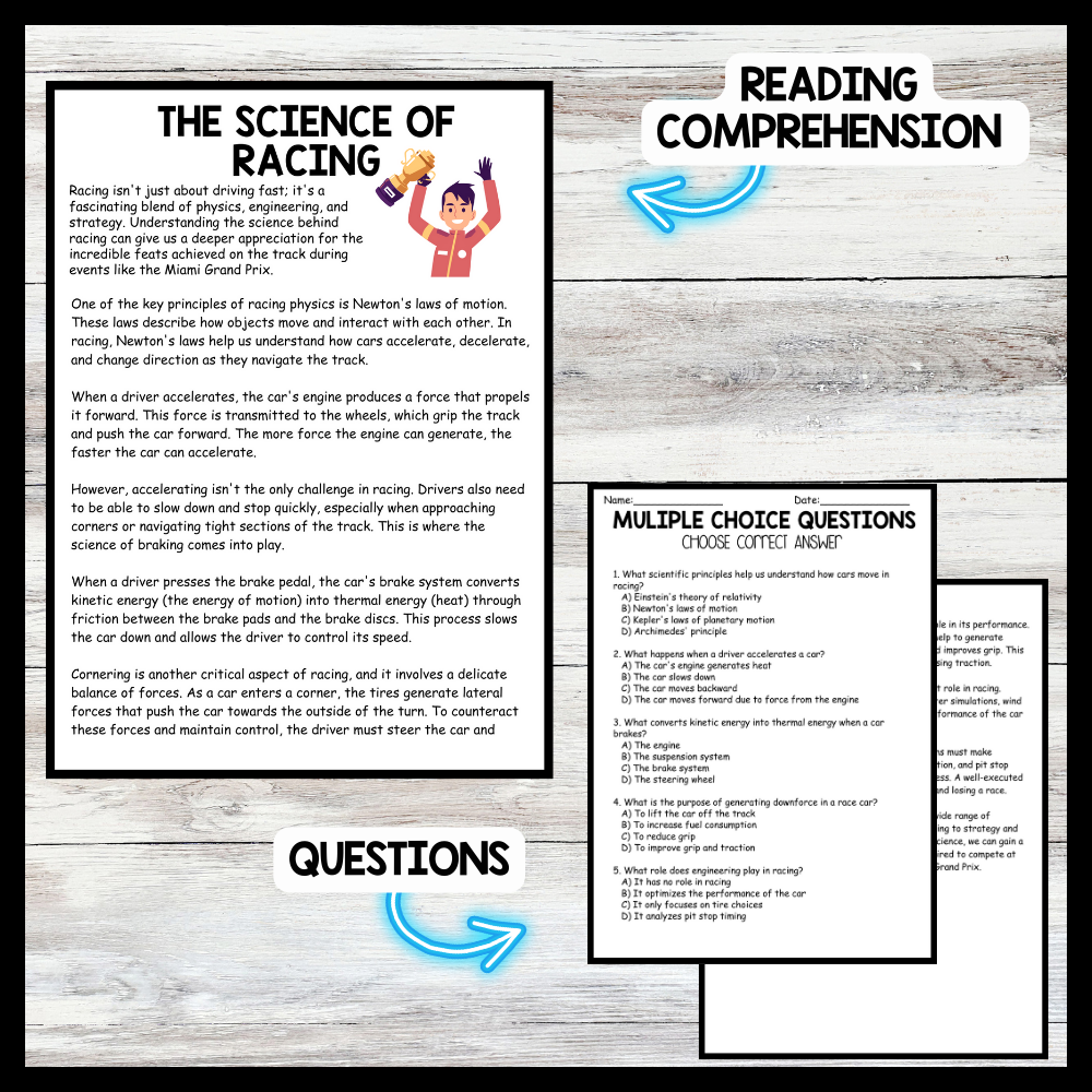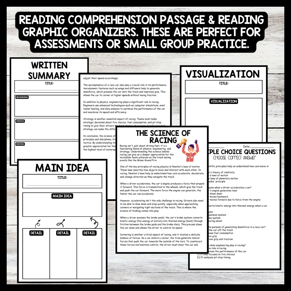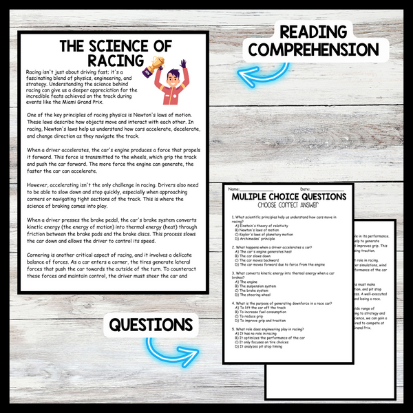 Grow your students knowledge with this Nonfiction Reading Comprehension Passage -  The Science of Racing These reading practice passages are perfect for: warm-up, bell work, homework, or weekly assessments. Students can use independently in literacy groups, guided reading groups. Different...View more