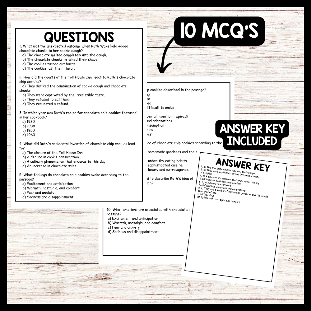For students, the familiar and beloved subject of chocolate chip cookies captures their interest, making learning enjoyable. The passage encourages critical thinking as students explore the origins and evolution of this popular treat. It also promotes creativity, allowing students to experiment with their own cookie recipes. Furthermore, activities centered around baking and sharing cookies encourage teamwork, communication, and the celebration of shared experiences, fostering a sense of community in the classroom.