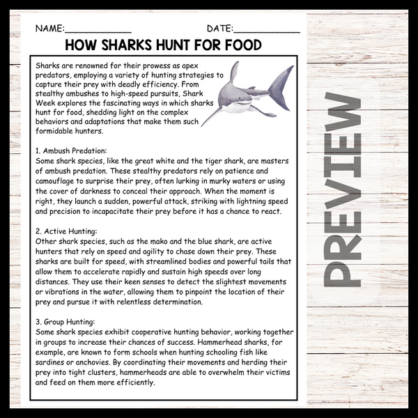 For teachers, this passage offers an engaging resource for lessons in marine biology and animal behavior, illustrating the diverse hunting techniques of sharks. It can help students understand predator-prey dynamics and the adaptations that make sharks effective hunters. Students benefit by gaining insight into the complexity of marine ecosystems and the evolutionary traits that contribute to the survival of these fascinating creatures.