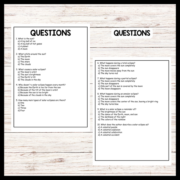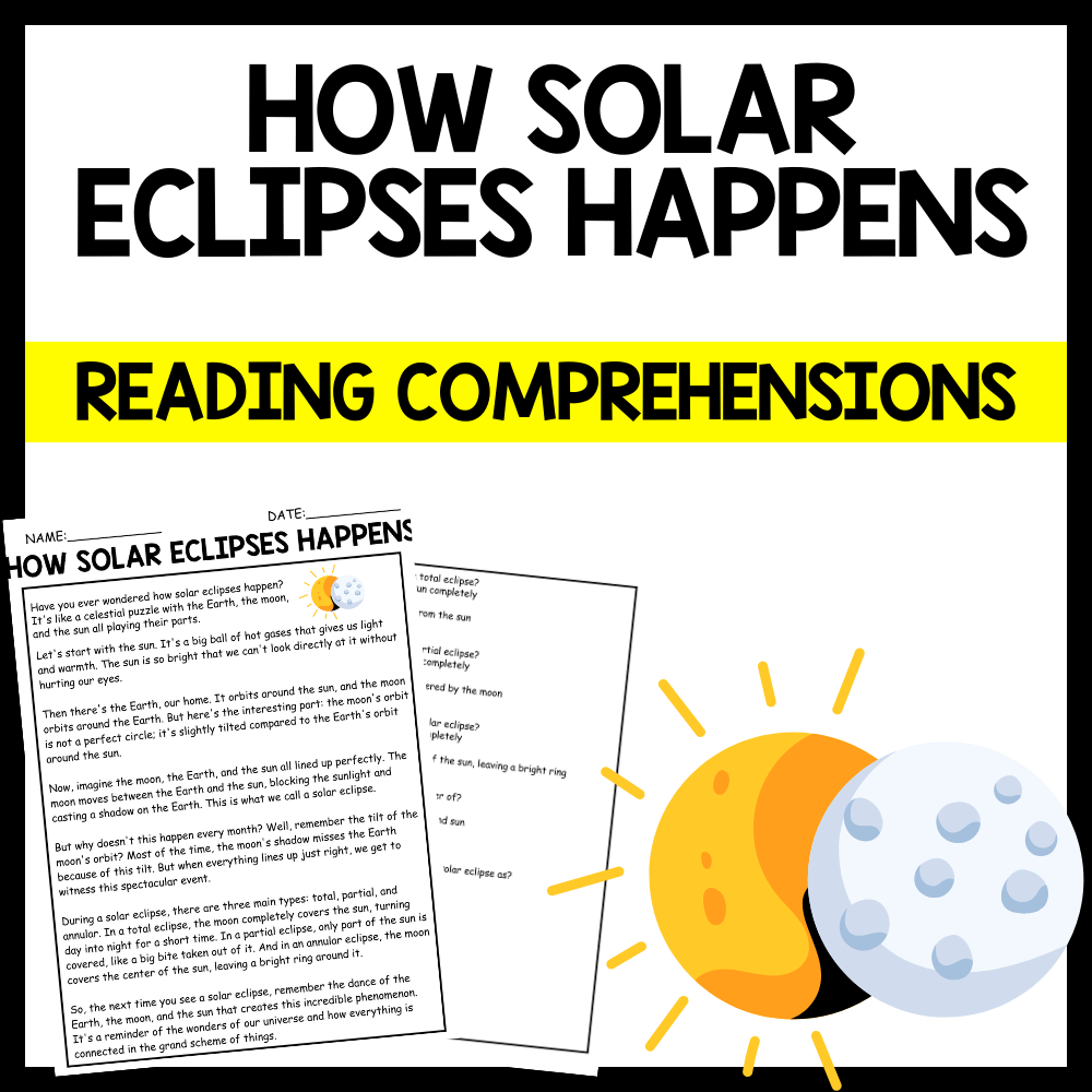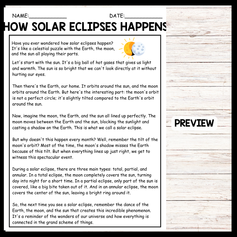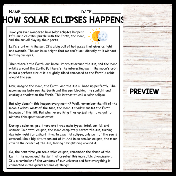 Engage your students with this informative reading comprehension activity that explores the science behind solar eclipses. "How Solar Eclipses Happen" provides an easy-to-understand explanation of the phenomenon, complete with key vocabulary, visuals, and questions to test understanding. This resource helps students improve reading skills while learning about the alignment of the sun, moon, and Earth. Perfect for science lessons, literacy integration, or independent reading activities. Ideal for upper elementary and middle school students. Aligned with STEM and NGSS standards.