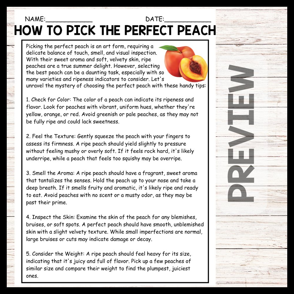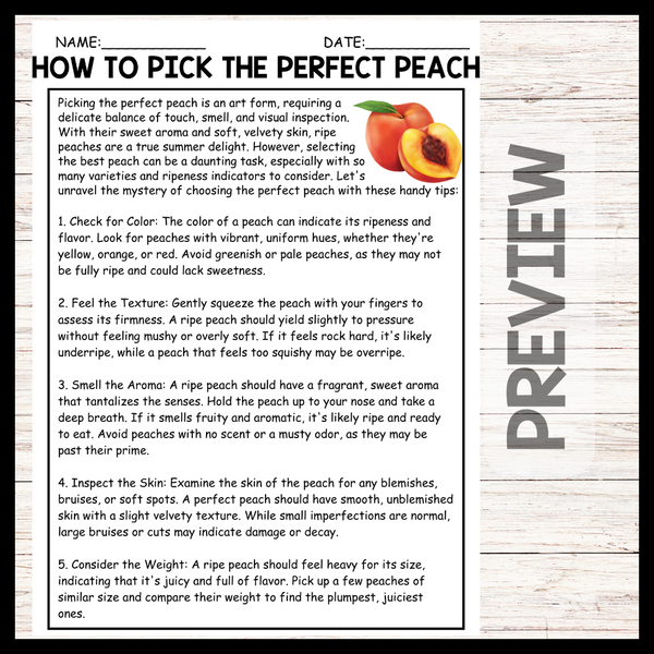 For students, the passage offers several benefits. It helps them develop keen observational skills and an understanding of the sensory qualities of food. Learning to select ripe peaches teaches them about fruit quality and freshness, promoting healthy eating habits. Additionally, this knowledge can be applied to other fruits and vegetables, encouraging students to make better choices when selecting produce. This practical skill fosters independence and confidence in their ability to evaluate and enjoy fresh, nutritious foods.