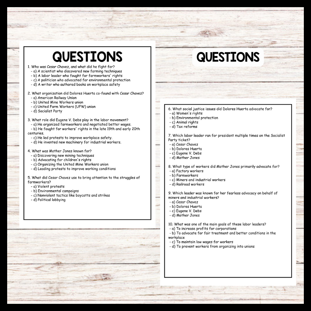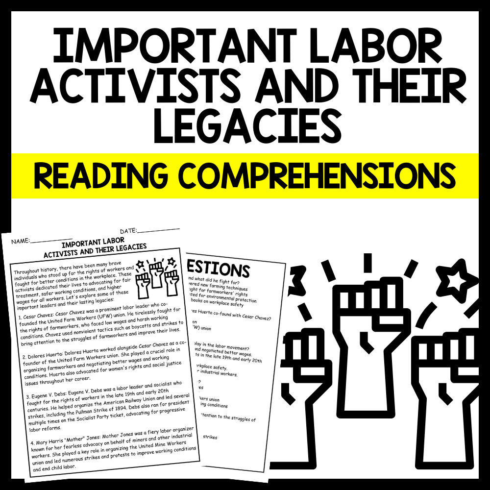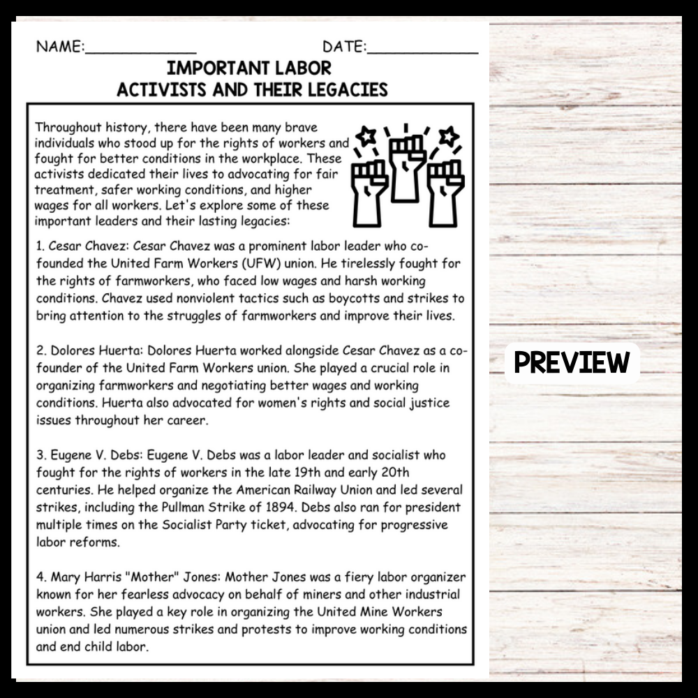 This passage provides brief descriptions of four influential labor leaders—Cesar Chavez, Dolores Huerta, Eugene V. Debs, and Mary Harris "Mother" Jones—highlighting their contributions to workers' rights and labor movements. It is helpful for teachers to use in class as it is simple and easy to understand, making it an accessible resource for introducing students to key figures in labor history and their impact on improving working conditions and advocating for social justice.
