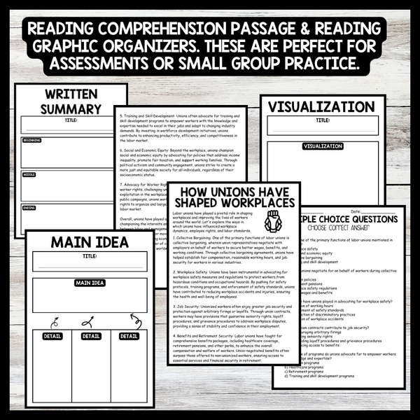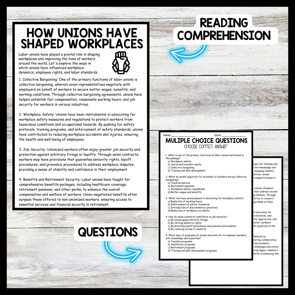 Grow your students knowledge with this Nonfiction Reading Comprehension Passage - Labor History Month - How Unions Have Shaped Workplaces These reading practice passages are perfect for: warm-up, bell work, homework, or weekly assessments. Students can use independently in literacy...View more