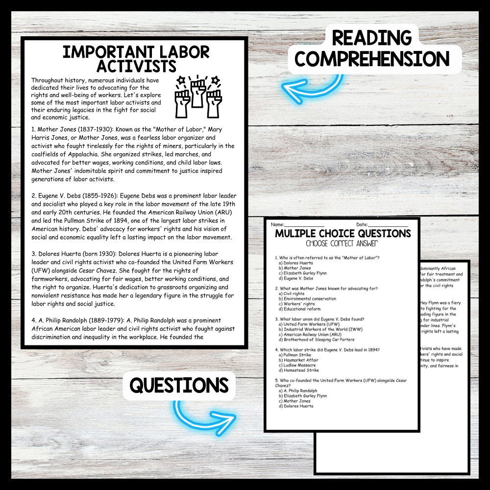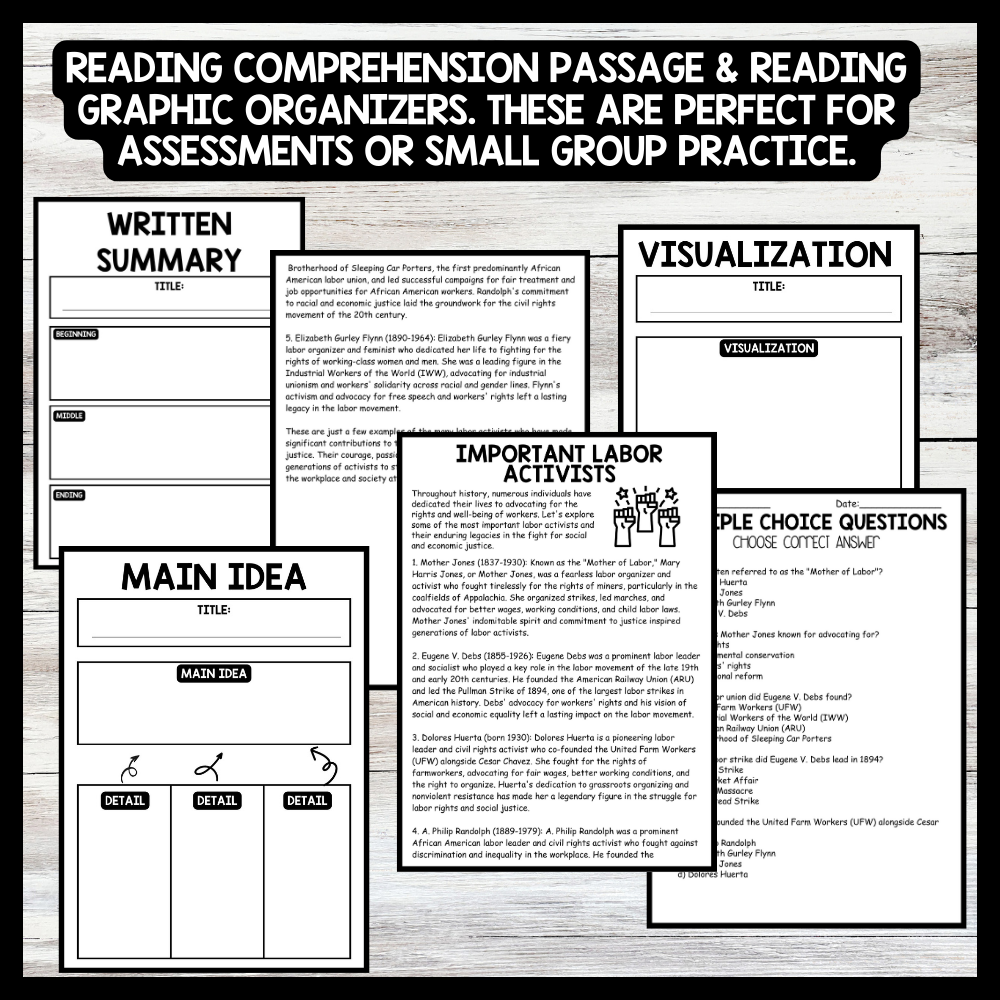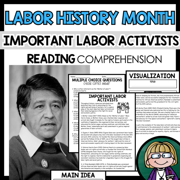 Grow your students knowledge with this Nonfiction Reading Comprehension Passage - Labor History Month - Important Labor Activists These reading practice passages are perfect for: warm-up, bell work, homework, or weekly assessments. Students can use independently in literacy groups, guided...View more