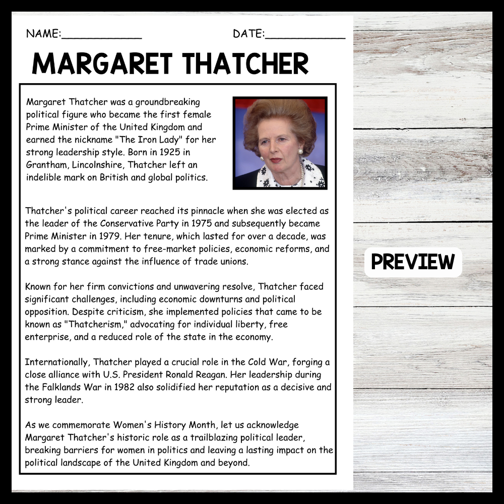 This passage outlines Margaret Thatcher's rise to power as the first female Prime Minister of the United Kingdom and her influential policies known as "Thatcherism." Teachers can use this straightforward and informative overview to discuss her impact on politics and economics, highlighting her role as a pioneering female leader.