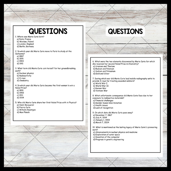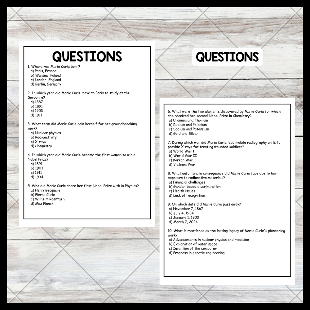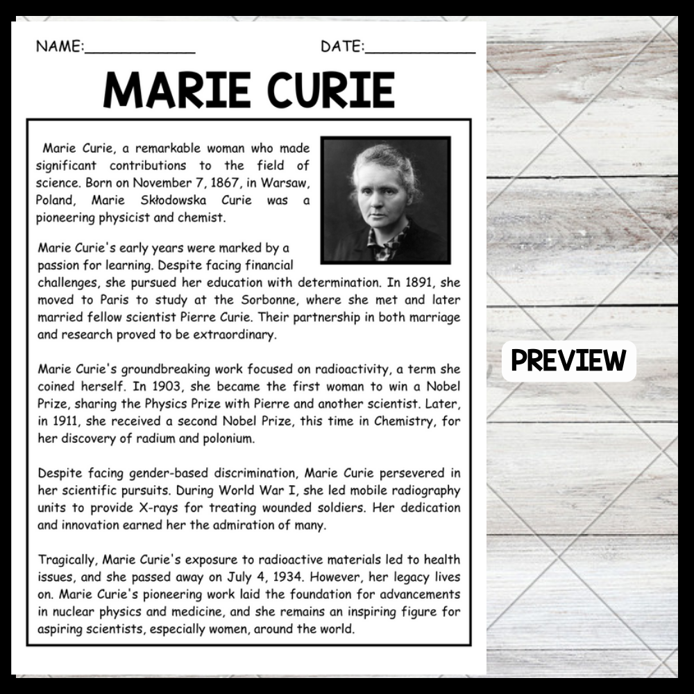 This passage succinctly outlines Marie Curie's remarkable life, from her early passion for learning to her groundbreaking scientific discoveries despite facing gender discrimination. It's a valuable resource for teachers to introduce students to Curie's achievements, highlighting her perseverance, innovation, and lasting impact on science and gender equality. The simple language and clear structure make it easily digestible for students of various ages and backgrounds.