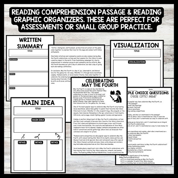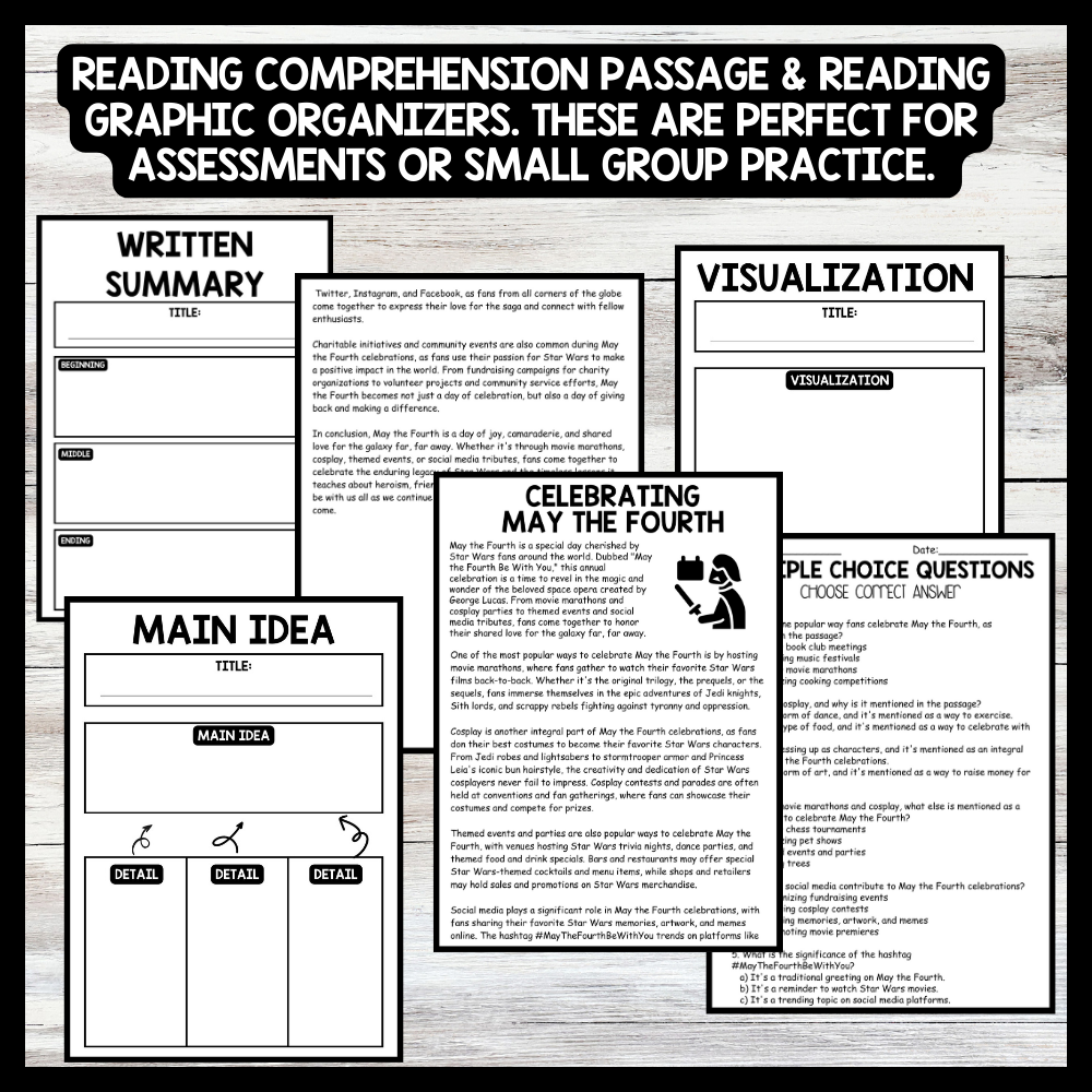 Different options provided- multiple choice, written response or graphic organizers to focus on individual skill.