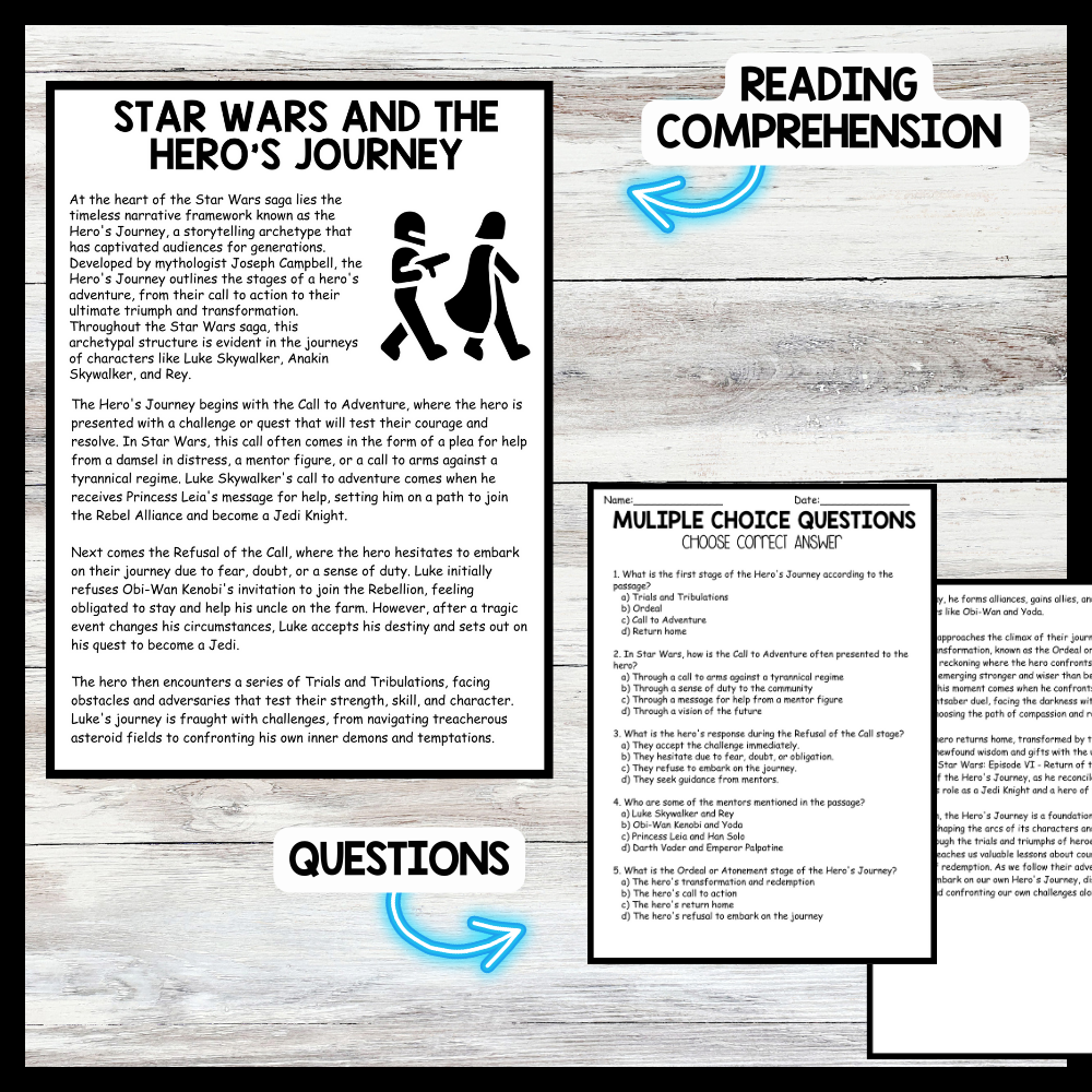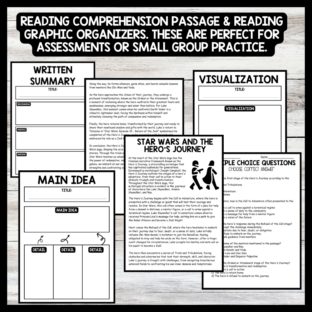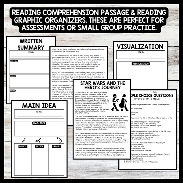 Different options provided- multiple choice, written response or graphic organizers to focus on individual skill.
