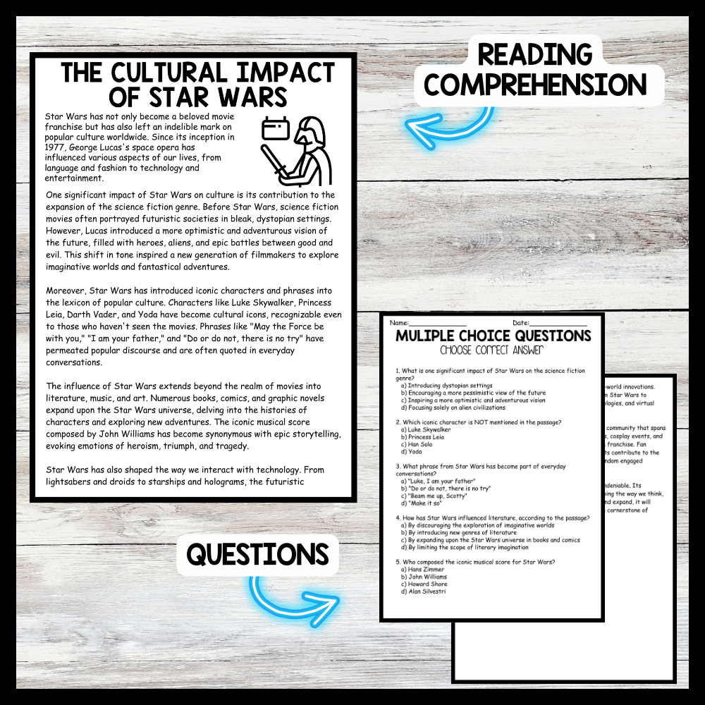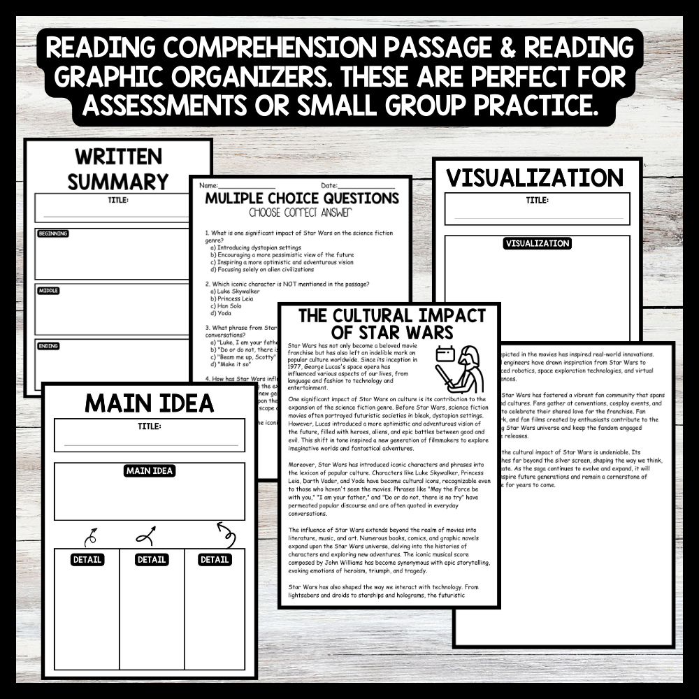 Grow your students knowledge with this Nonfiction Reading Comprehension Passage -  The Cultural Impact of Star Wars These reading practice passages are perfect for: warm-up, bell work, homework, or weekly assessments. Students can use independently in literacy groups, guided reading...View more