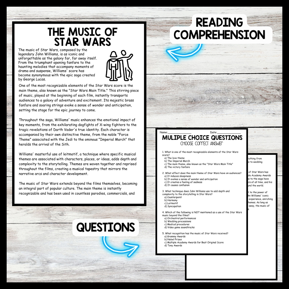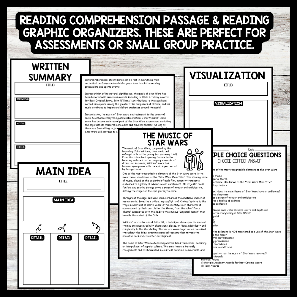 Grow your students knowledge with this Nonfiction Reading Comprehension Passage -  The Music of Star Wars These reading practice passages are perfect for: warm-up, bell work, homework, or weekly assessments. Students can use independently in literacy groups, guided reading groups....View more