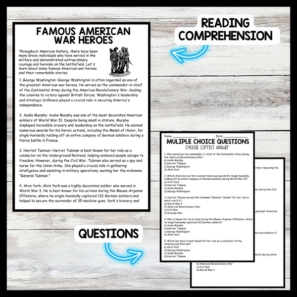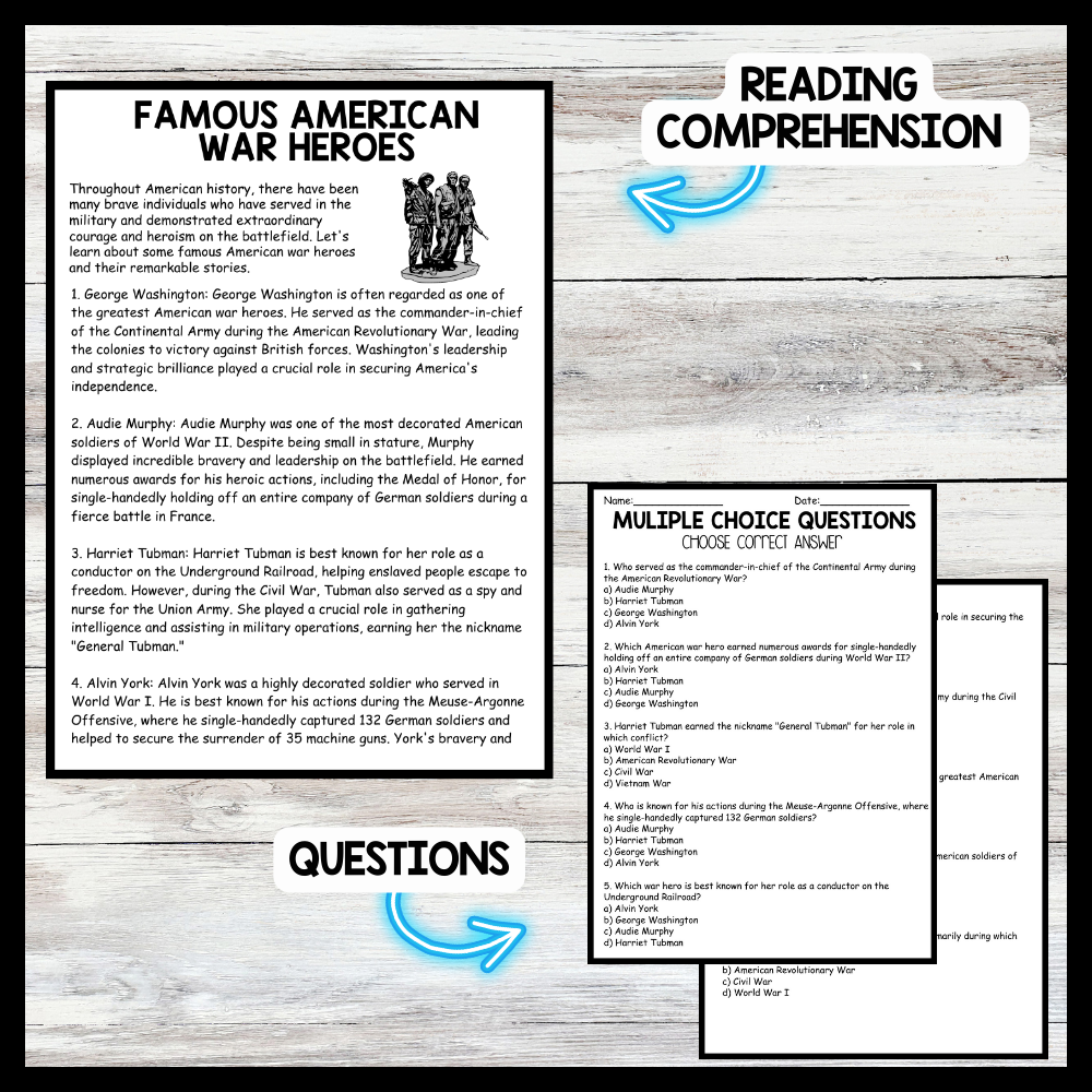Memorial Day - Famous American War Heroes Reading comprehension Passage and Questions
