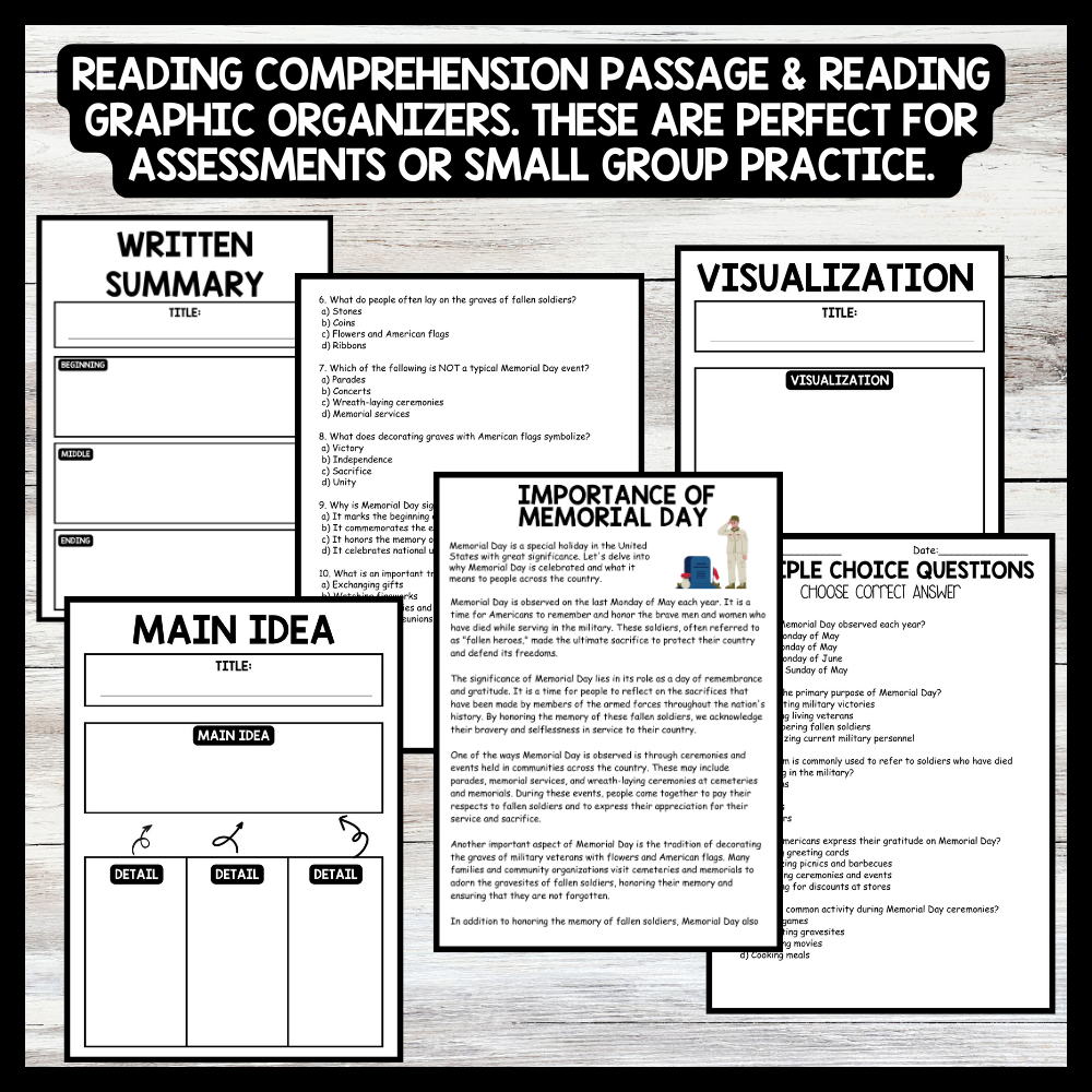 Grow your students knowledge with this Nonfiction Reading Comprehension Passage - Memorial Day - Importance of Memorial Day These reading practice passages are perfect for: warm-up, bell work, homework, or weekly assessments. Students can use independently in literacy groups, guided...View more