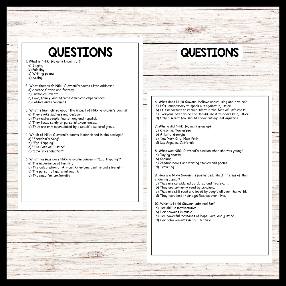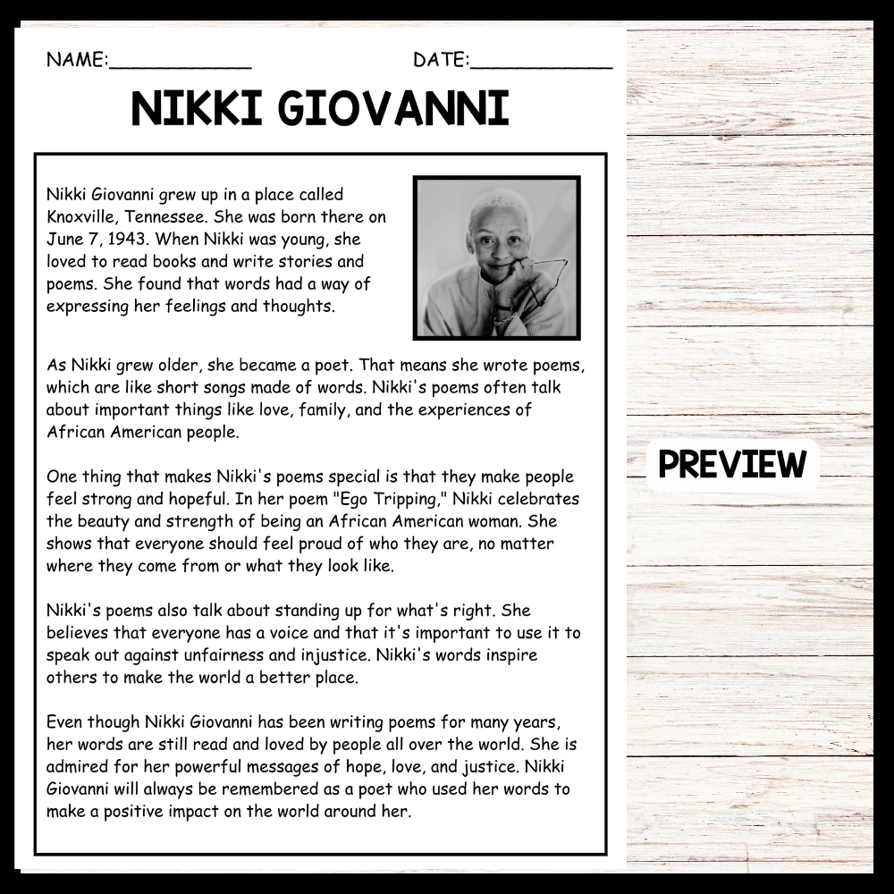 This passage provides an overview of Nikki Giovanni's work as a poet and social justice advocate, highlighting her focus on themes of love, family, and the African American experience. It's helpful for teachers as it emphasizes Giovanni's role in promoting messages of strength and hope, making her poetry a valuable tool for discussing social justice and empowerment in the classroom.
