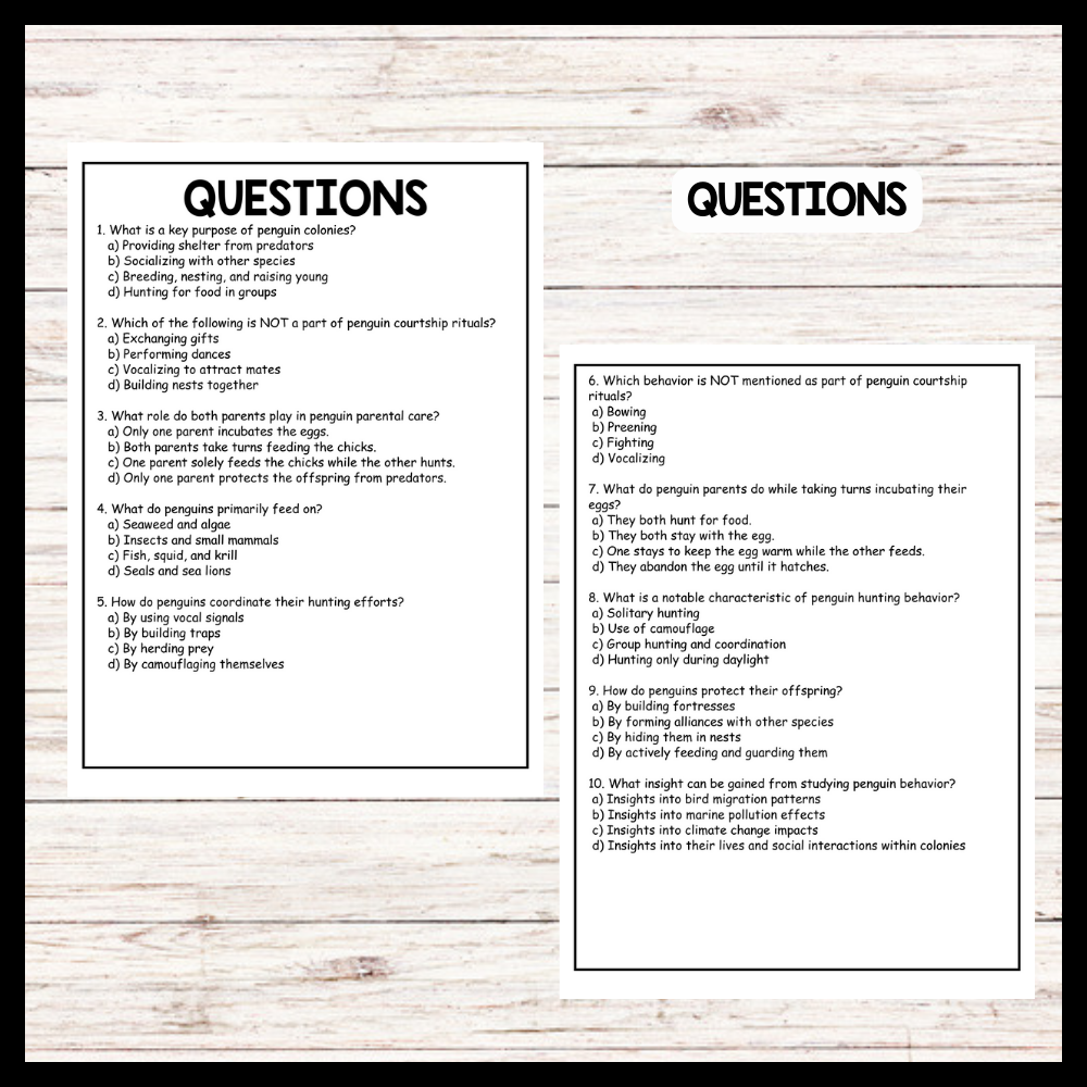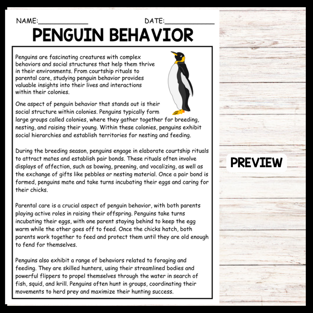 This passage details penguin social structures, courtship rituals, and parental care, providing a comprehensive look at their colony behaviors and foraging techniques. It's useful for teachers as it offers rich, detailed information that is easy for students to understand and visualize, enhancing their learning experience.
