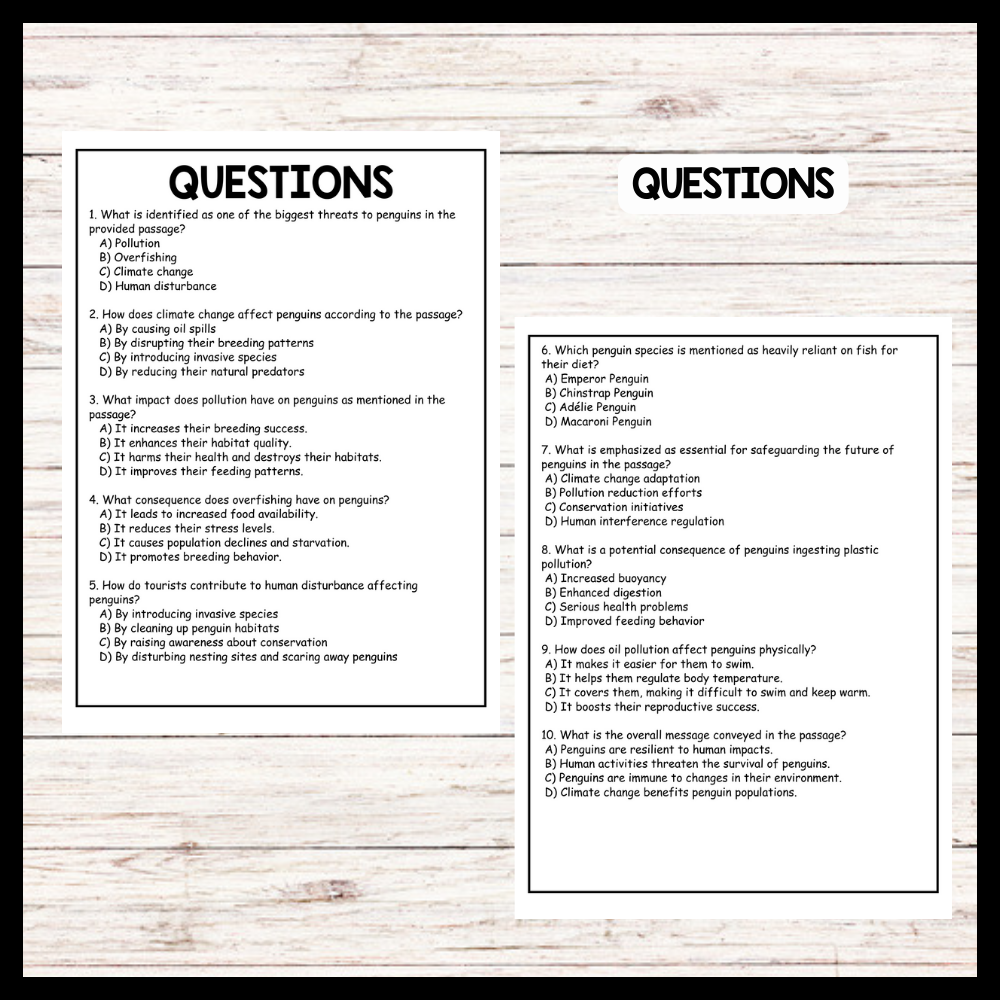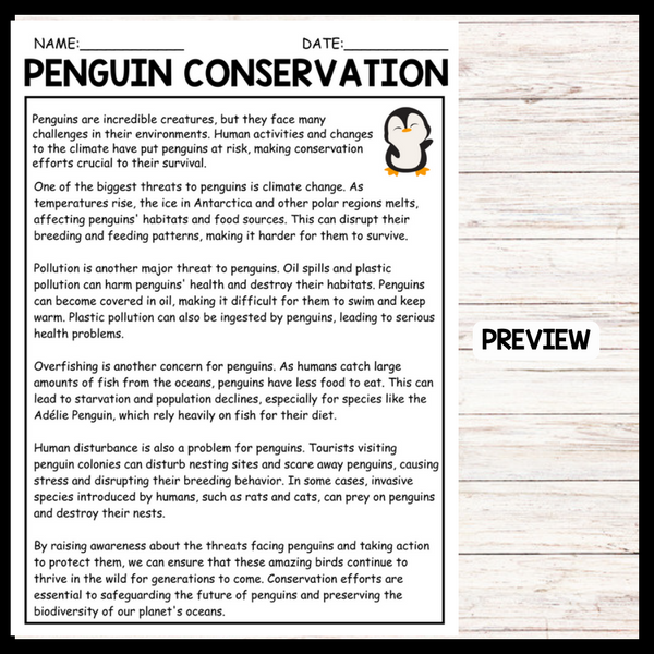This passage outlines the significant threats penguins face, including climate change, pollution, overfishing, and human disturbance. It is helpful for teachers as it presents crucial environmental issues in a straightforward manner, making it accessible for students to understand the importance of conservation efforts to protect penguin populations.