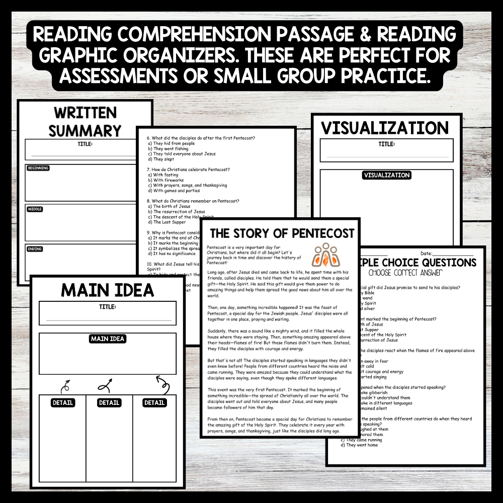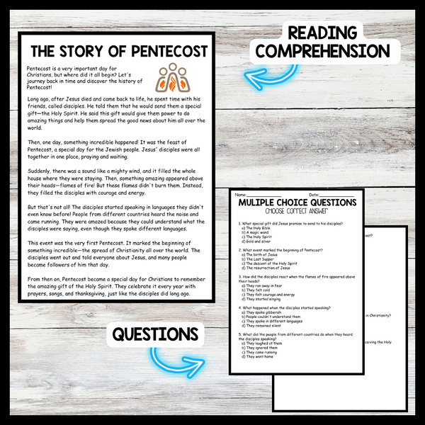 Grow your students knowledge with this Nonfiction Reading Comprehension Passage - Pentecost - The Story of Pentecost These reading practice passages are perfect for: warm-up, bell work, homework, or weekly assessments. Students can use independently in literacy groups, guided reading...View more