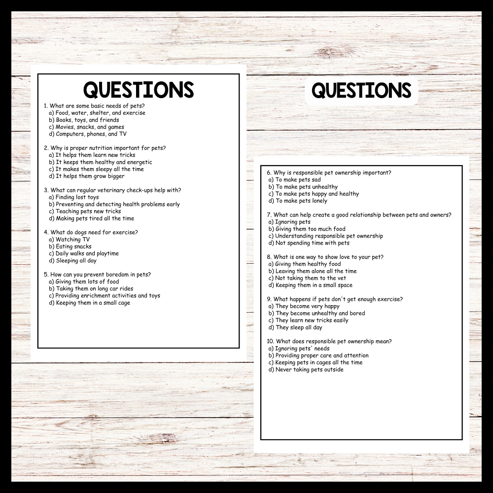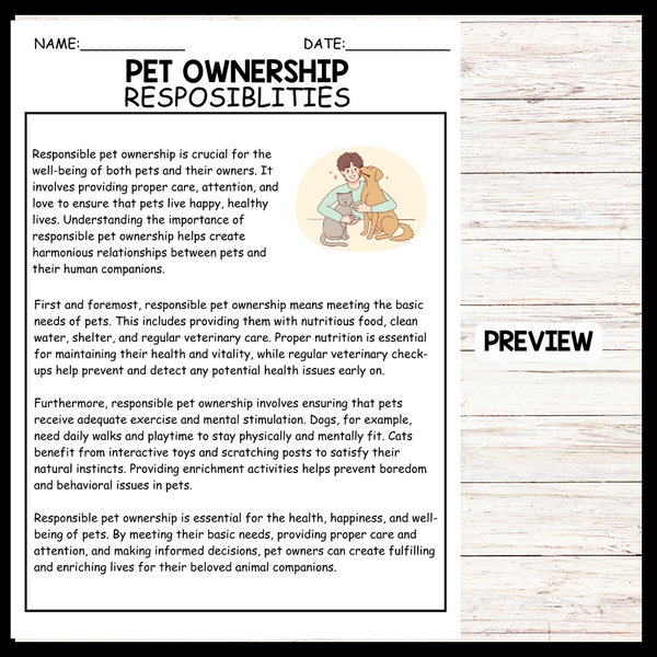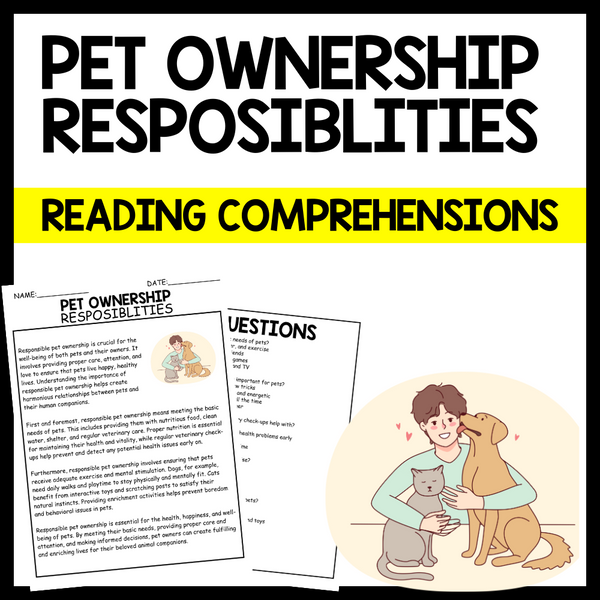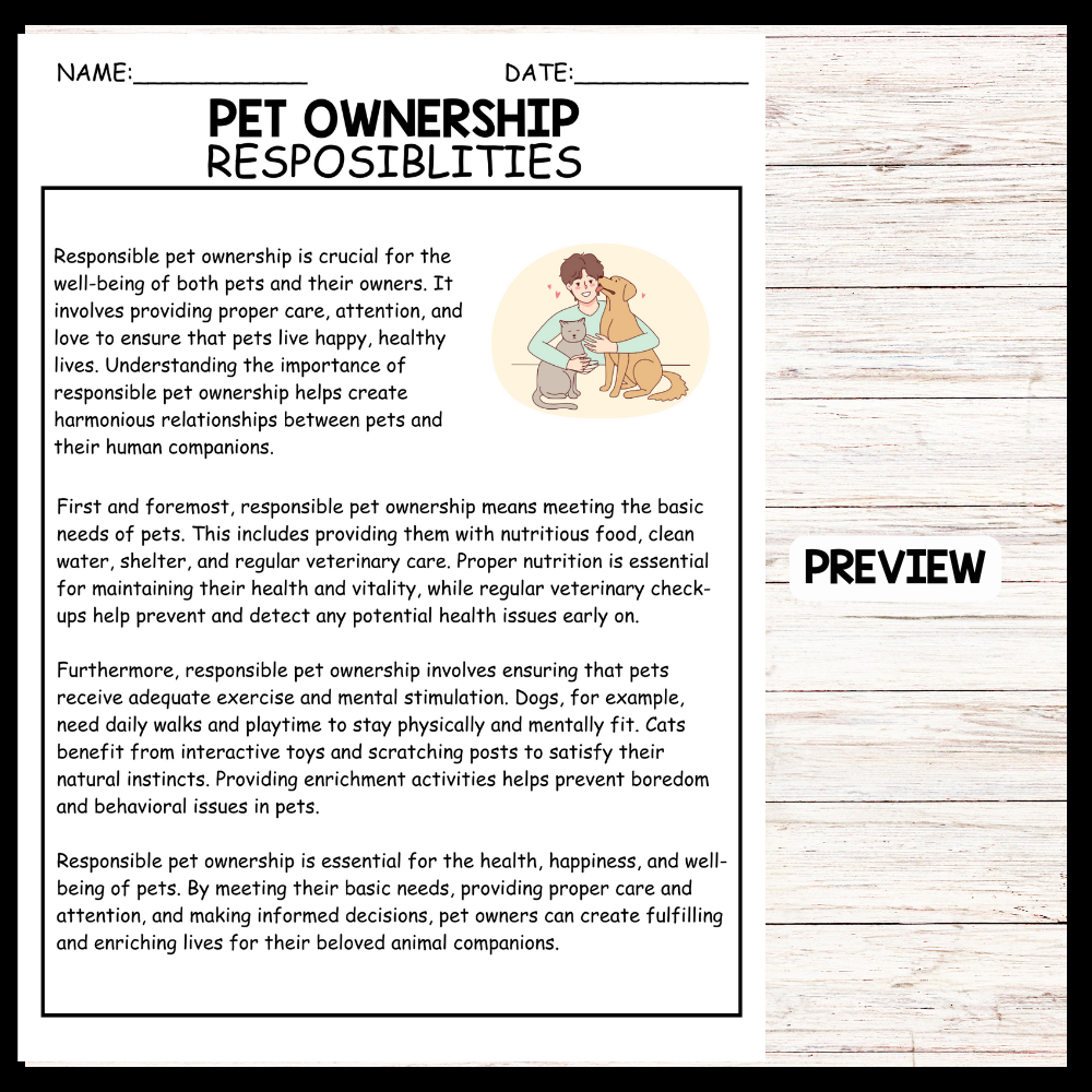 This reading passage explains the concept of responsible pet ownership, emphasizing the importance of meeting pets' basic needs, providing proper care, and making informed decisions. It serves as a helpful educational resource for teachers to use in class, as it breaks down key aspects of pet care in simple language that students can easily understand. Teachers can use this passage to educate students about the responsibilities of pet ownership and encourage empathy and compassion towards animals.