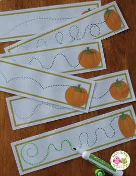 Children will practice pre-writing skills as they trace each pumpkin's vine. Use with dry erase markers, crayons, waxed yarn, or play dough coils. This activity is great for developing the fine motor skills and manual dexterity needed for writing. The set includes 12 cards with varying degrees of difficulty.