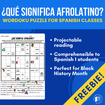 This product contains a simplified definition of the term 'Afrolatino' as a projectable reading and a Wordoku puzzle. It is comprehensible to first year Spanish students.