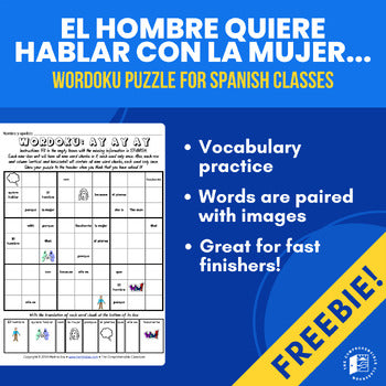 This product contains one Wordoku puzzle which will help students internalize the meaning of the sentence "El hombre quiere hablar con la mujer porque él piensa que ella es fascinante". The sentence is divided into nine chunks, and students complete the puzzle by deciphering images and translations of the target sentence to fill in the empty boxes in Spanish.