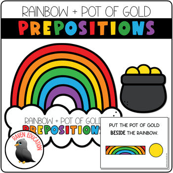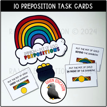 Enjoy teaching about prepositions with this Rainbow + Pot of Gold preposition activity. There are 10 preposition task cards included. Students will participate by placing the pot of gold in the specified prepositions. Ex. "Put the pot of gold under the rainbow."