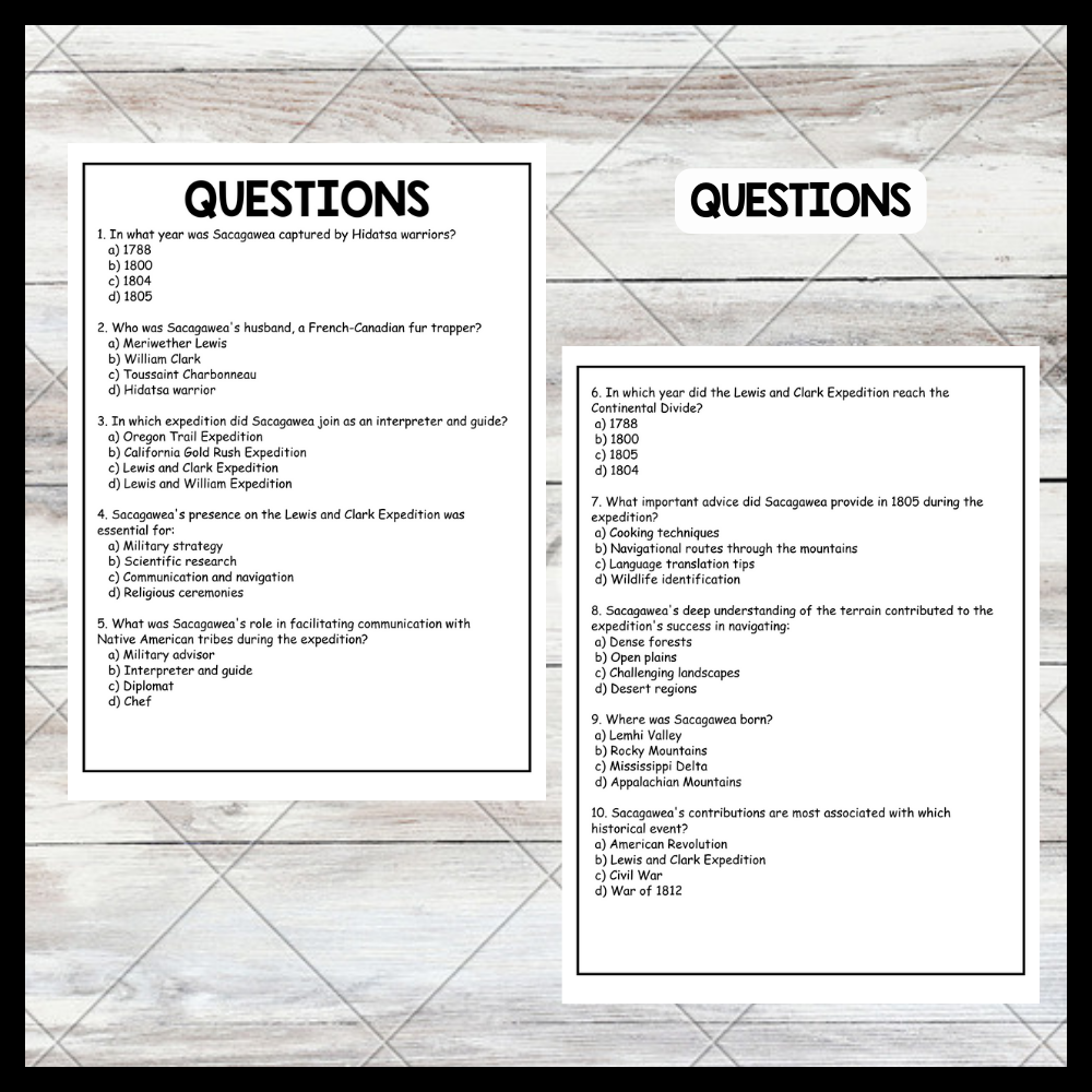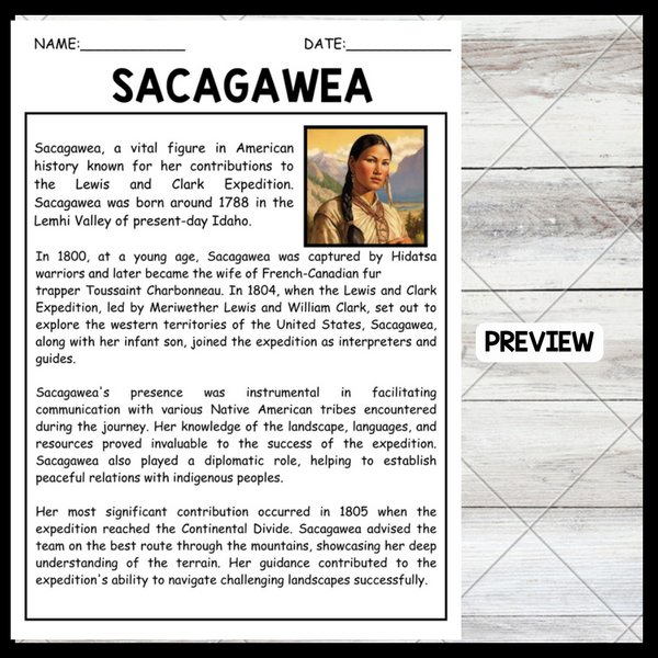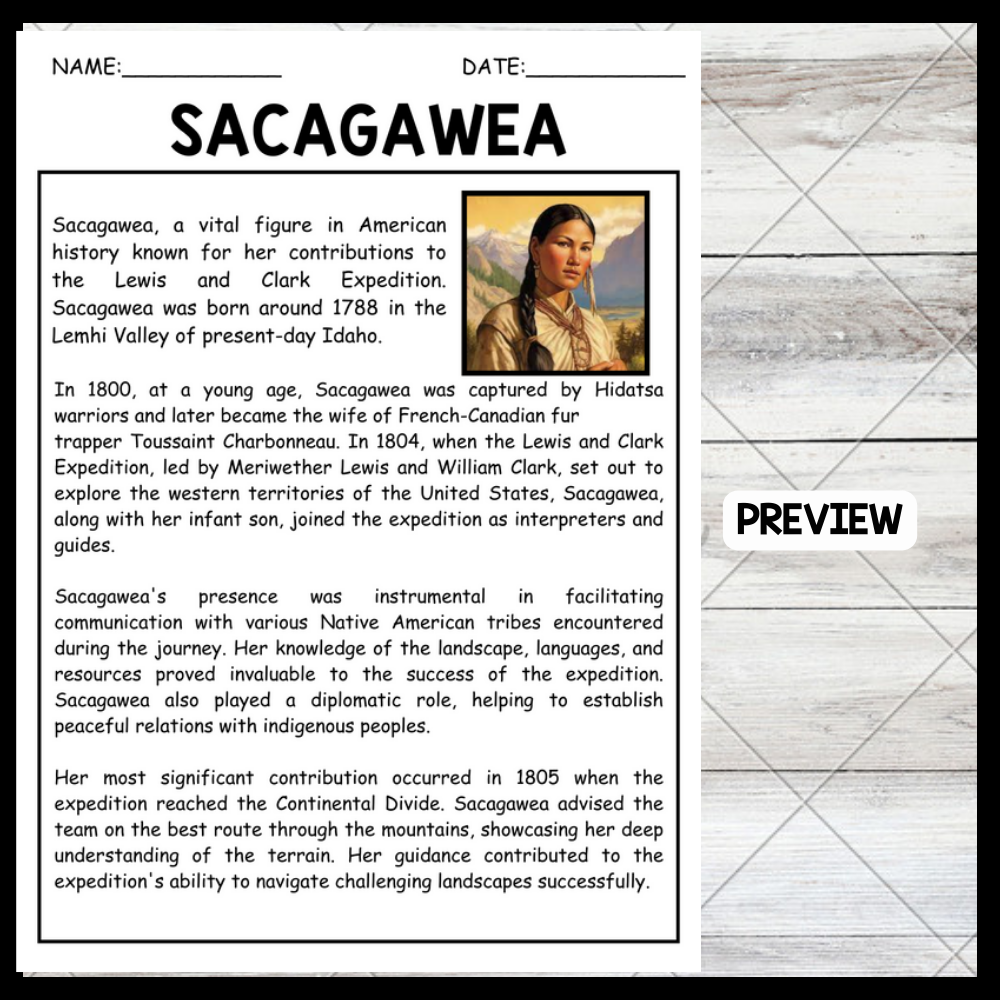 This passage offers a concise summary of Sacagawea's involvement in the Lewis and Clark Expedition, making it an excellent educational resource for teachers to use in the classroom. It highlights Sacagawea's role as an interpreter, guide, and diplomat during the expedition, emphasizing her invaluable contributions to the success of the journey. The straightforward language and chronological presentation of events make it accessible for students to grasp Sacagawea's significance in American history and the exploration of the western territories.