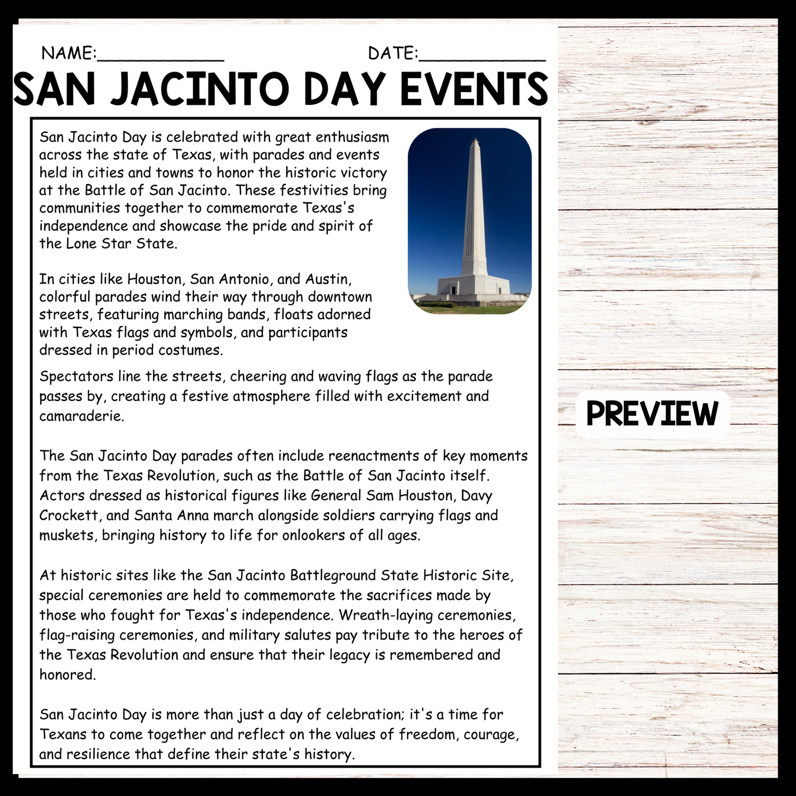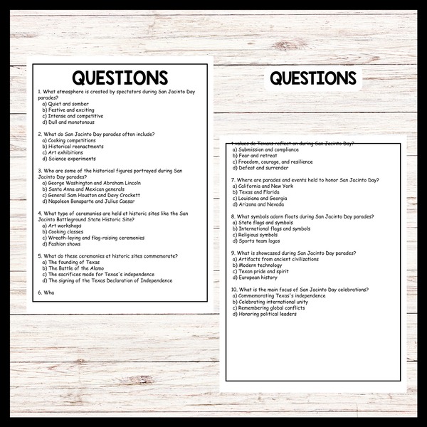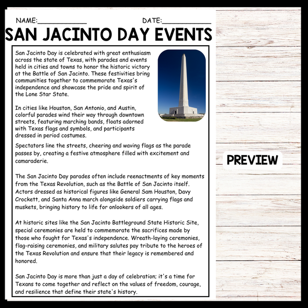 This passage vividly depicts the spirited festivities and solemn commemorations that mark San Jacinto Day celebrations in Texas. Teachers can utilize this passage to illustrate the vibrant cultural traditions and historical significance of the holiday to students. By discussing the parades, reenactments, and ceremonies described in the passage, educators can engage students in learning about the Texas Revolution and the enduring values of freedom and courage cherished by Texans. Additionally, the passage encourages reflection on the importance of honoring the sacrifices of those who fought for Texas's independence, fostering a deeper appreciation for the state's rich heritage among students.