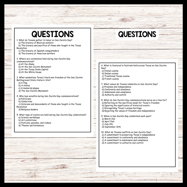 The passage beautifully captures the essence of San Jacinto Day celebrations in Texas, highlighting both the solemn remembrance of the sacrifices made during the Texas Revolution and the joyous celebration of Texas's unique heritage and culture. Teachers can use this...View more