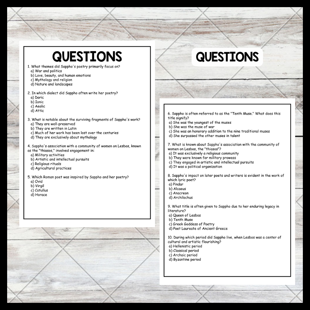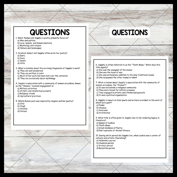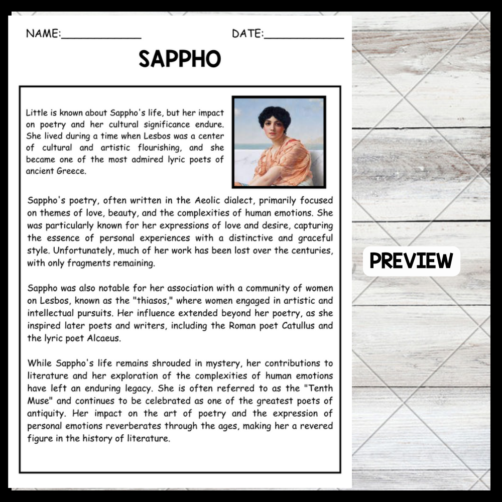 This passage provides a concise overview of Sappho's life and poetry, highlighting her focus on themes of love and beauty, as well as her association with a community of women on Lesbos. Teachers can use this passage to introduce students to Sappho's significance as a poet of antiquity and her contributions to literature, despite much of her work being lost over time. The passage also emphasizes Sappho's lasting influence on later poets and writers, making it a valuable resource for understanding her enduring legacy in the history of literature.