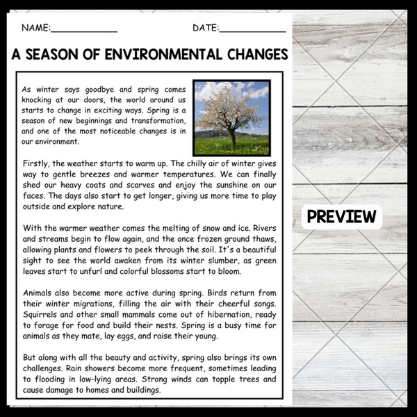 Spring brings a refreshing transformation as the weather warms up, replacing winter's chill with gentle breezes and sunshine. This season's longer days allow for more outdoor activities. Melting snow and ice revive rivers and streams, while plants and flowers begin to bloom, signaling nature's awakening. Animals become active, with birds returning and small mammals ending their hibernation to forage and nest. However, spring also has its challenges, such as frequent rain showers that can cause flooding and strong winds that may lead to property damage.