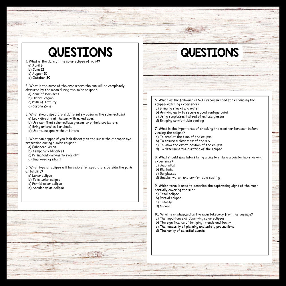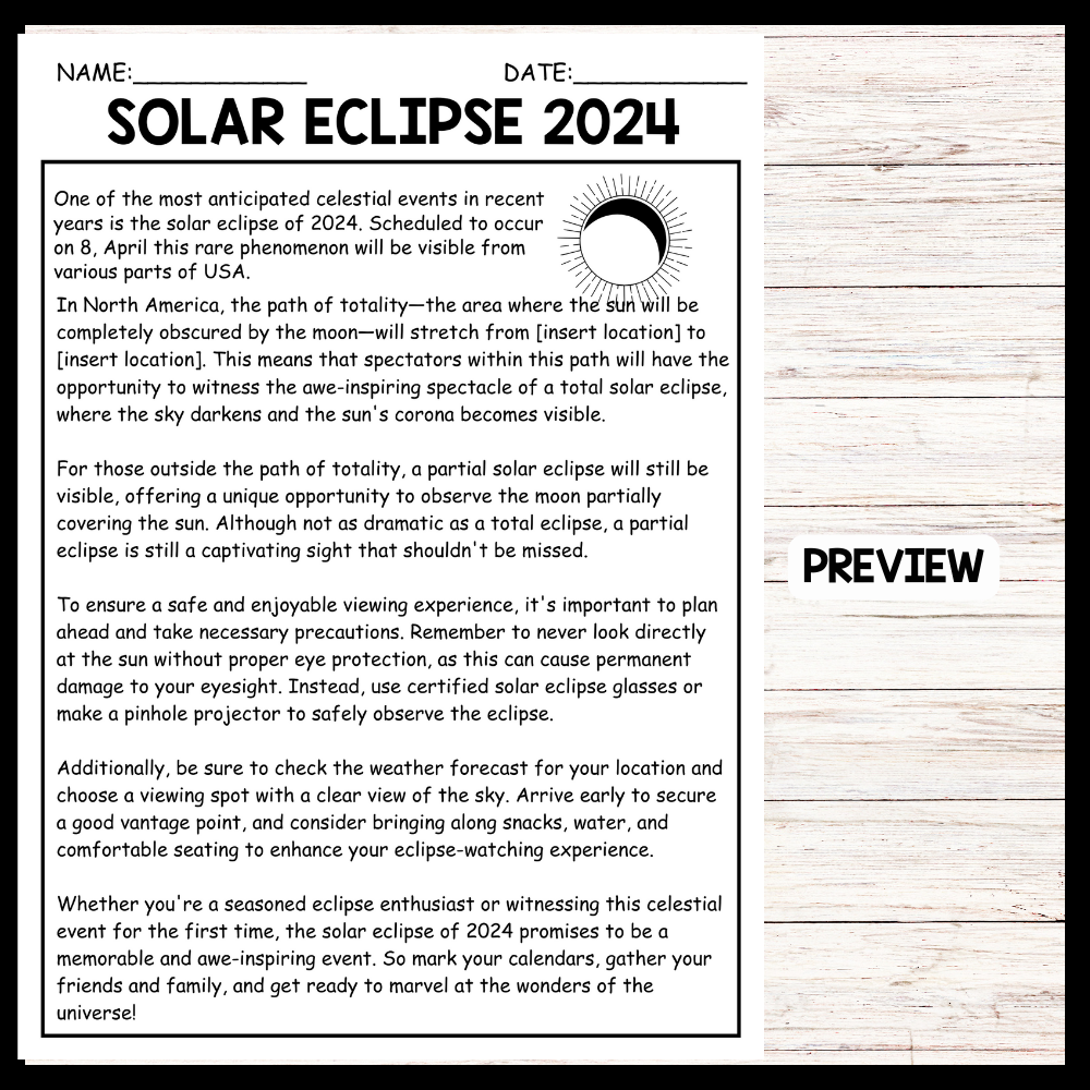This passage provides a detailed overview of the upcoming solar eclipse in North America, emphasizing the path of totality and the opportunity for both total and partial eclipse viewing. It's helpful for teachers as it includes practical advice for safely observing the eclipse, making it an informative and engaging resource for students to learn about this celestial event.