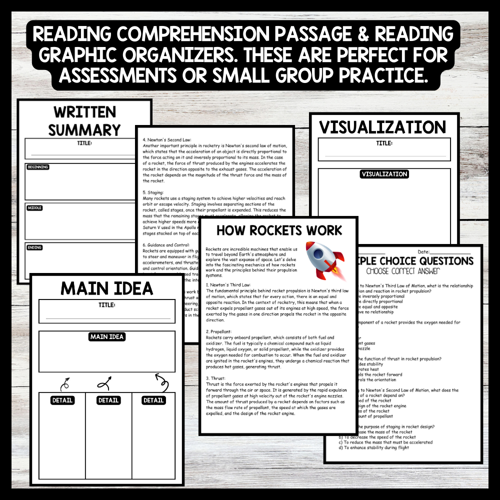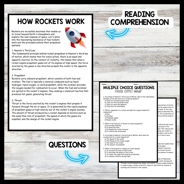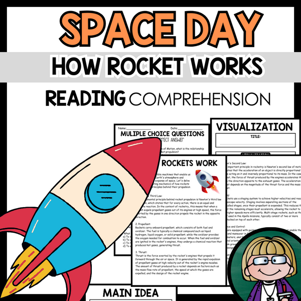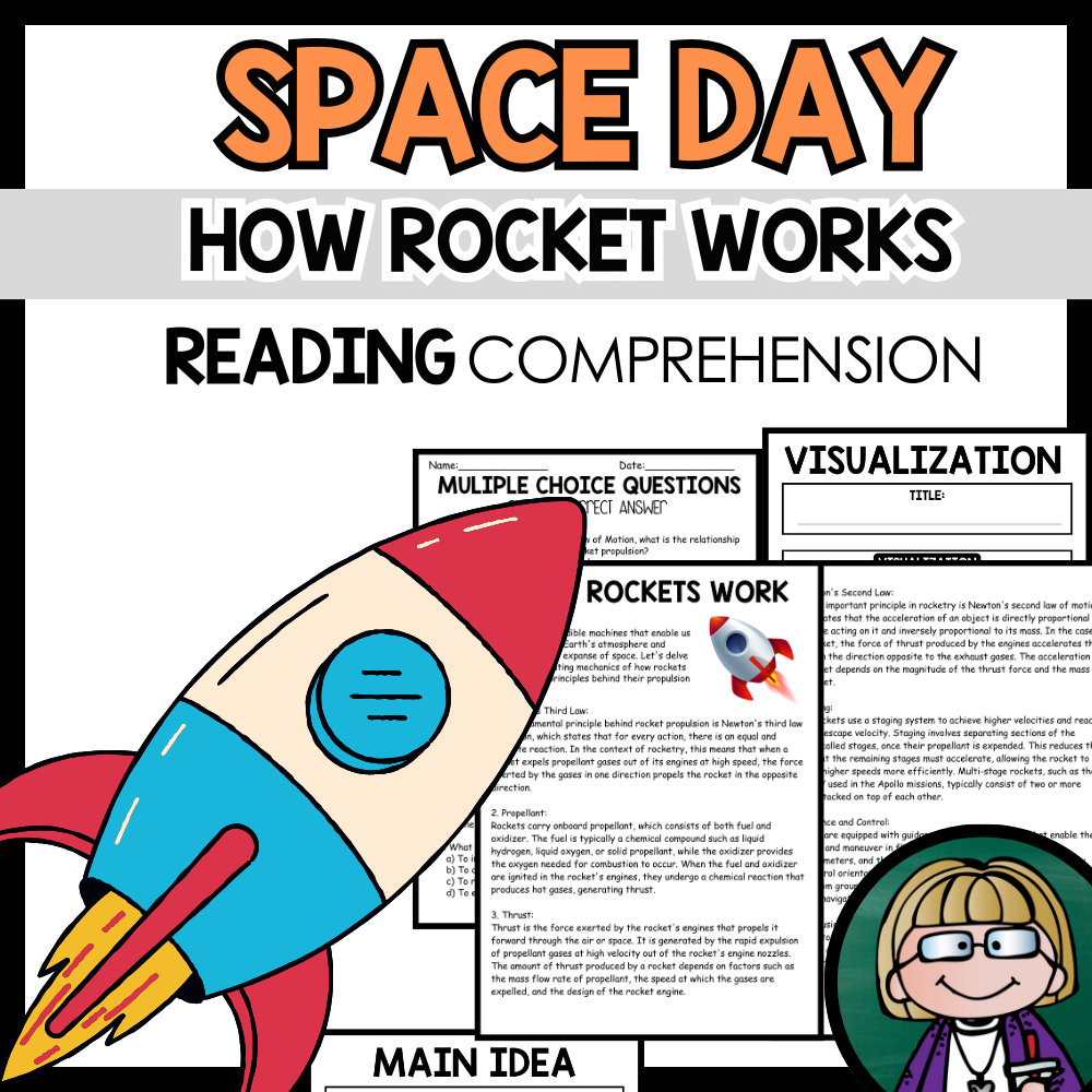 Grow your students knowledge with this Nonfiction Reading Comprehension Passage -  Space Day - How Rocket Works  These reading practice passages are perfect for: warm-up, bell work, homework, or weekly assessments. Students can use independently in literacy groups, guided reading...View more