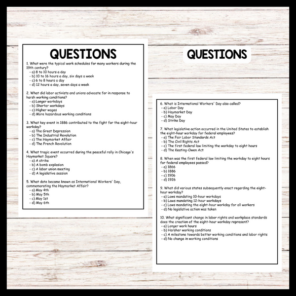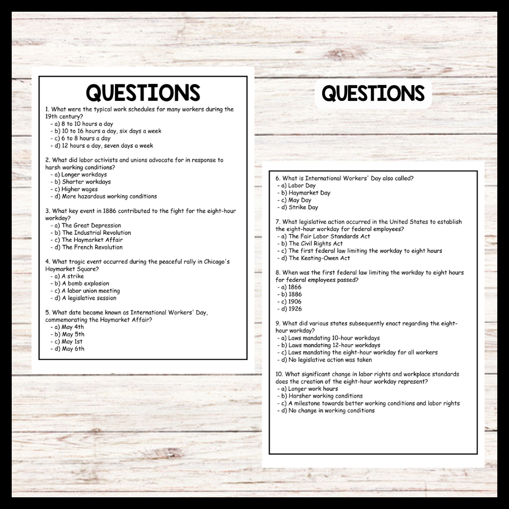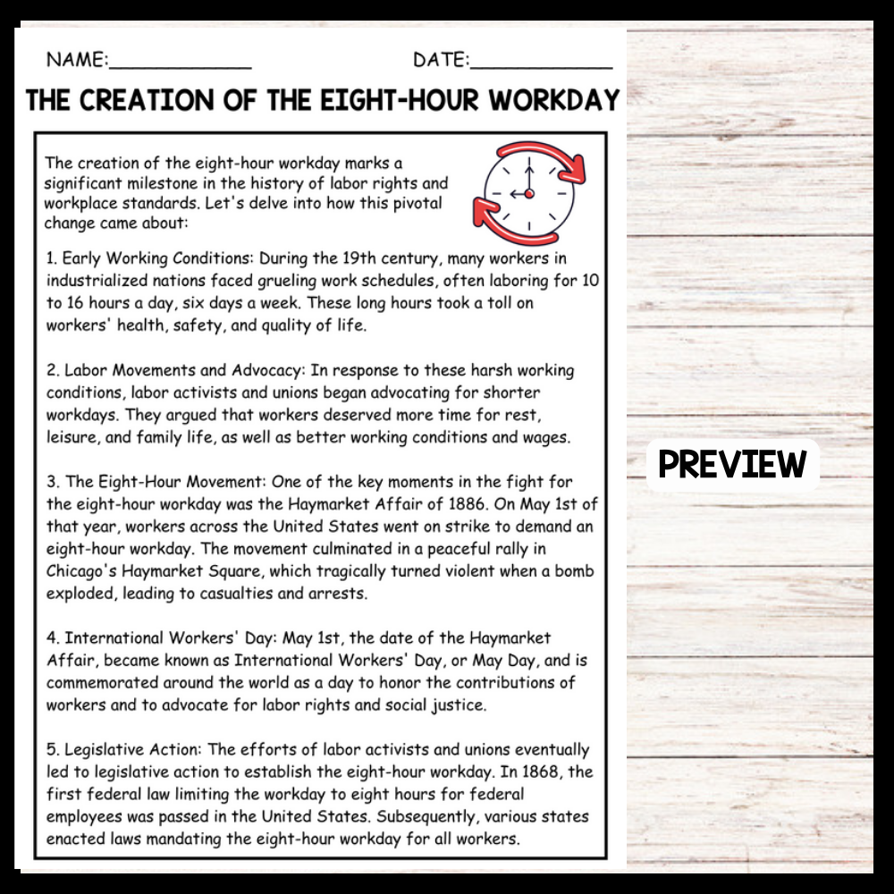 This passage describes the historical development of the eight-hour workday, highlighting early harsh working conditions, labor movements' advocacy, the significance of the Haymarket Affair, the establishment of International Workers' Day, and eventual legislative actions. This overview is beneficial for teachers as it clearly outlines the progression of labor rights, making it easy for students to grasp the importance of labor movements and the origins of the eight-hour workday.