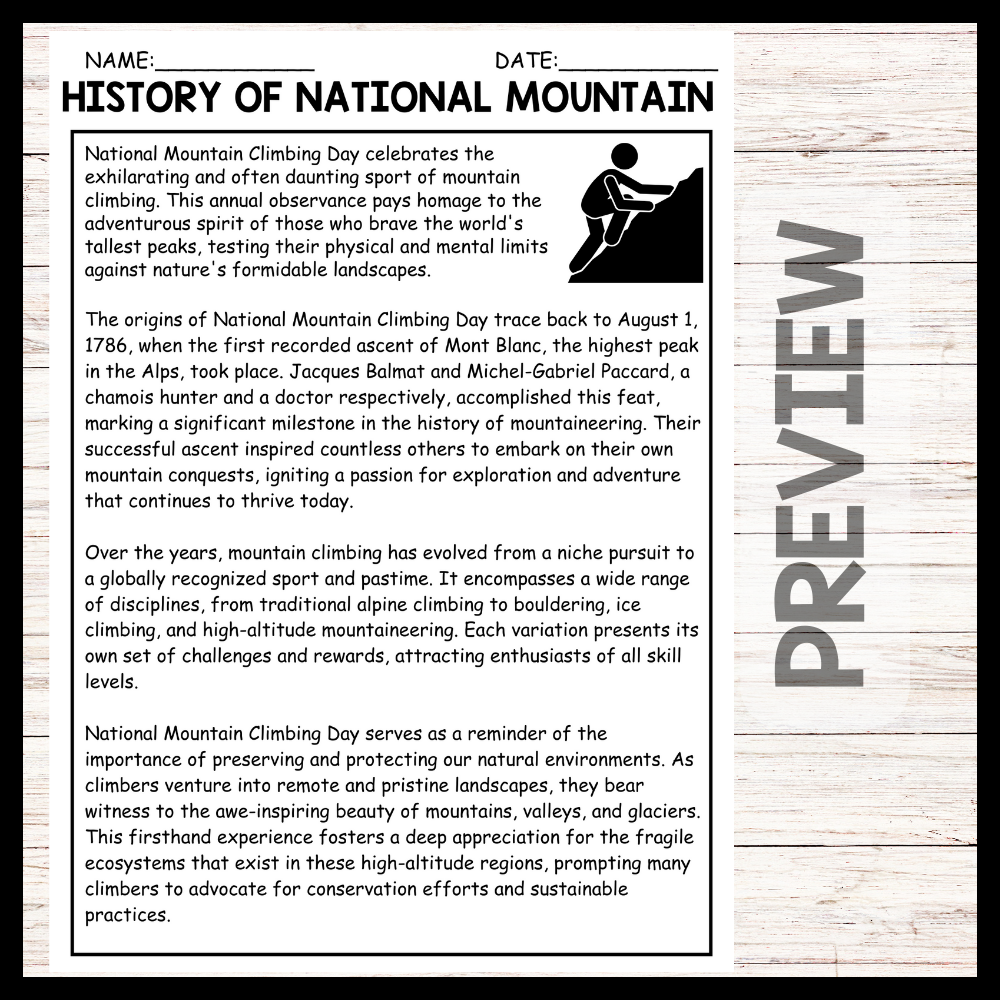 The passage on the origins and significance of National Mountain Climbing Day provides valuable content for teachers to incorporate into their classroom discussions. It offers historical context by tracing the holiday's roots back to the first recorded ascent of Mont Blanc in 1786, introducing students to key figures like Jacques Balmat and Michel-Gabriel Paccard. Furthermore, it highlights the evolution of mountain climbing as a sport, showcasing its diverse disciplines and attracting enthusiasts of all skill levels.
