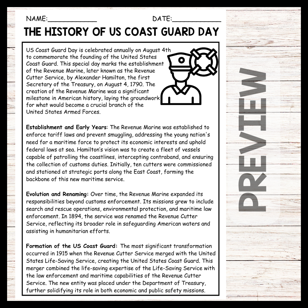 Additionally, the passage's explanation of the Coast Guard's expanded roles, such as search and rescue, environmental protection, and humanitarian efforts, provides students with a comprehensive understanding of the agency's multifaceted responsibilities. Celebrating US Coast Guard Day and learning about its history not only educates students on American heritage but also inspires discussions on civic duty, public service, and the evolution of governmental roles in society.