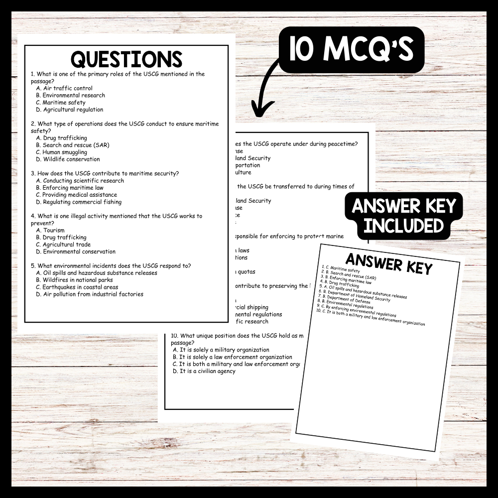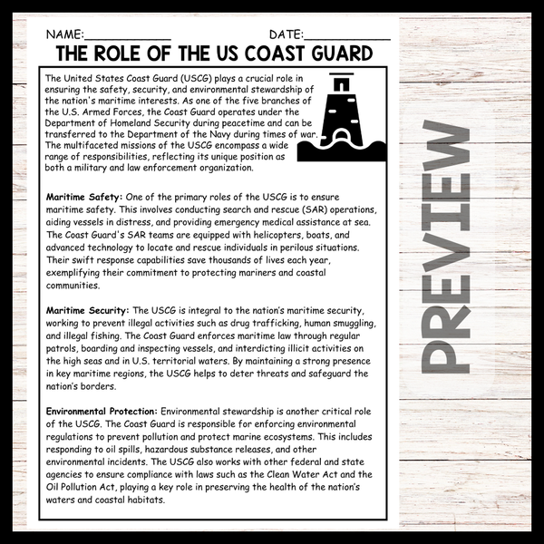 The passage on the United States Coast Guard (USCG) is a valuable educational tool for teachers to use in the classroom, offering students insight into the multifaceted roles of the USCG in ensuring maritime safety, security, and environmental protection. By reading about the Coast Guard's search and rescue operations, students learn about the vital life-saving efforts and advanced technology used to protect mariners and coastal communities. This fosters an understanding of emergency response and the importance of swift action in perilous situations.