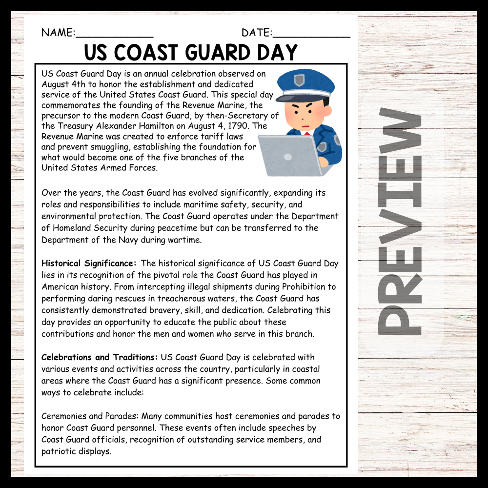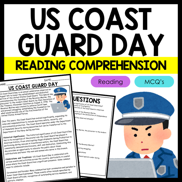 The passage on US Coast Guard Day is an excellent resource for teachers to use in the classroom as it provides historical context and civic education, enhancing students' understanding of American history and the role of the Coast Guard. By reading this passage, students can appreciate the significance of the Coast Guard's establishment and its evolution from the Revenue Marine to a crucial branch of the United States Armed Forces. This knowledge fosters a sense of national pride and respect for military service.