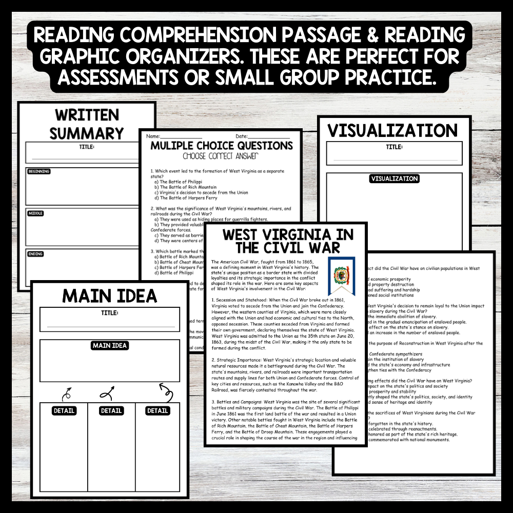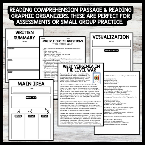 Grow your students knowledge with this Nonfiction Reading Comprehension Passage - West Virginia Day - the Civil War These reading practice passages are perfect for: warm-up, bell work, homework, or weekly assessments. Students can use independently in literacy groups, guided...View more