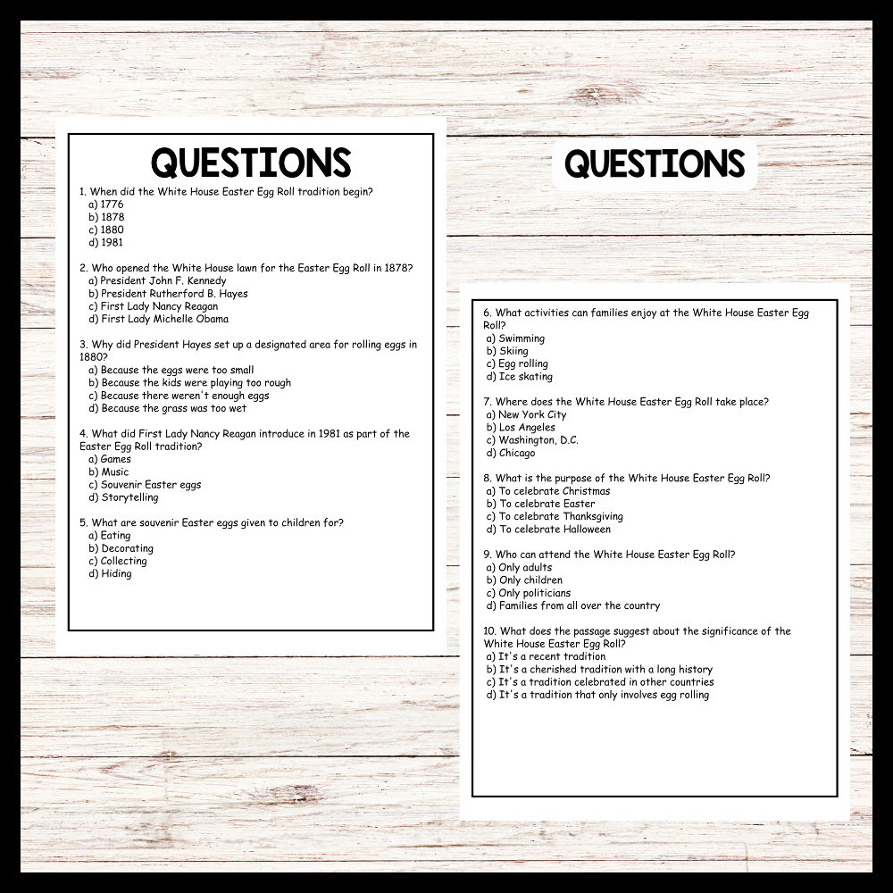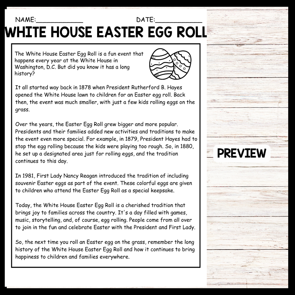 This passage traces the history of the White House Easter Egg Roll, from its modest beginnings in 1878 to its current status as a cherished tradition. It highlights key moments, such as President Hayes' introduction of designated egg-rolling areas and First Lady Nancy Reagan's addition of souvenir Easter eggs. Teachers can use this passage to teach students about historical events and traditions in a fun and engaging way, while also emphasizing the importance of cultural celebrations.