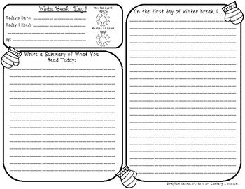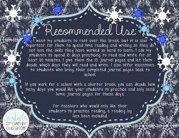 Each journal page has a place for students to record the date, book read, time spent reading, and number of pages read. There is also a place for them to write a summary of what they read and another space for them to journal. Each day has a different topic for students to write about. Journal topics include writing about the various things they are doing over the break, favorite winter activities, and creative writing pieces with a winter theme. For teachers who just want their students to practice reading over the break, a reading log is included for students to record the date, what they read, and how long they read. There is also a place for an adult to sign, confirming the student actually did read that day.