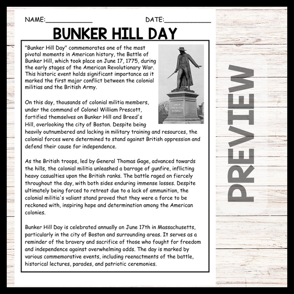 - "BUNKER HILL DAY" BUNKER HILL DAY Reading Comprehension